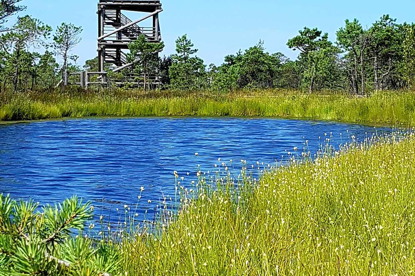 Bewundern Sie das einzigartige Ökosystem mit Moos, Kiefern und ruhigen Teichen. Der Weg umfasst eine hölzerne Fußbrücke, ideal zum Beobachten von Preiselbeersträuchern, Sumpfporst und dunklen Teichen. Verpassen Sie nicht den Aussichtsturm für einen Panoramablick.