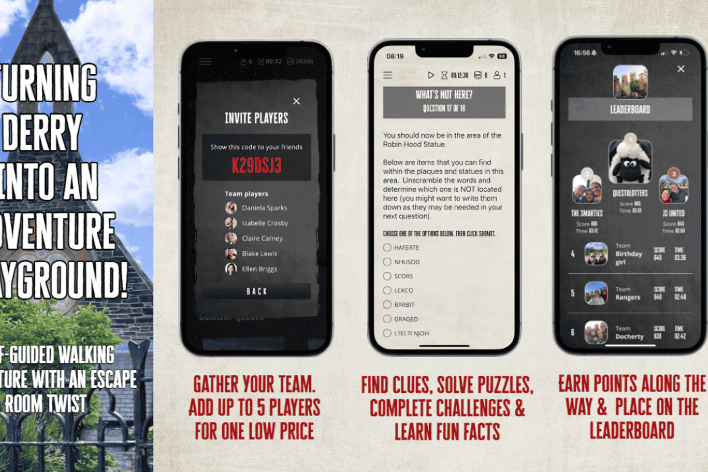 Verwandle die Straßen von Derry in deinen eigenen Abenteuer-Spielplatz! Beginne eine selbstgeführte Erkundung der historischen Stadtmauern und lebhaften Straßen mit der Go Quest Adventures App. Löse Rätsel, erfülle Herausforderungen und sammle Punkte, während du Derrys reiche Geschichte und kulturelle Höhepunkte entdeckst.