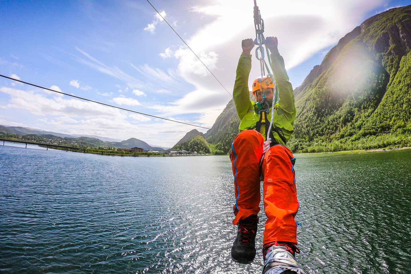 Schweben Sie über den Vefsna-Fluss und genießen Sie die atemberaubende Landschaft, bevor Sie sicher in den malerischen Gärten des Fru Haugans Hotel landen, dem ältesten Hotel in Nordnorwegen. Das automatische Bremssystem garantiert Ihre Sicherheit während des gesamten Erlebnisses.