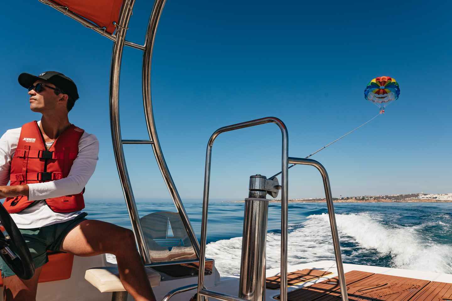 Beginnen Sie Ihr Abenteuer in der Marina von Albufeira, wo die Crew eine Sicherheitsunterweisung gibt und Sie mit einer Schwimmweste und einem Gurtzeug ausstattet. Einmal an Bord, wird der Kapitän den Fallschirm in den Himmel lenken und es Ihnen ermöglichen, Höhen von bis zu 80 Metern zu erreichen.