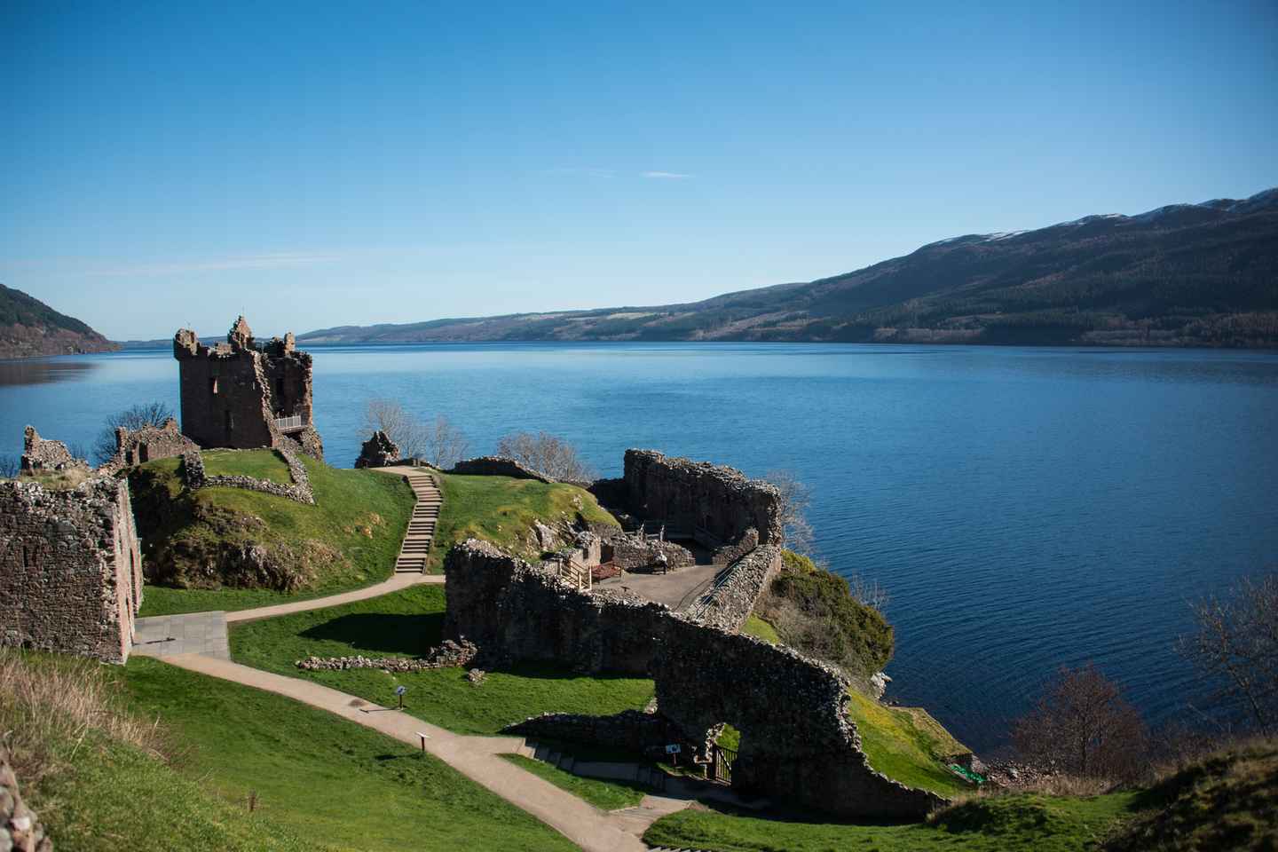 Gehen Sie an Land, um die faszinierenden Ruinen von Urquhart Castle zu erkunden. Entdecken Sie seine bewegte Vergangenheit und genießen Sie die Panoramablicke auf die umliegenden Landschaften. Danach entspannen Sie sich, während der Bus Sie auf einer malerischen Fahrt durch die atemberaubenden Highlands zurück nach Inverness bringt.