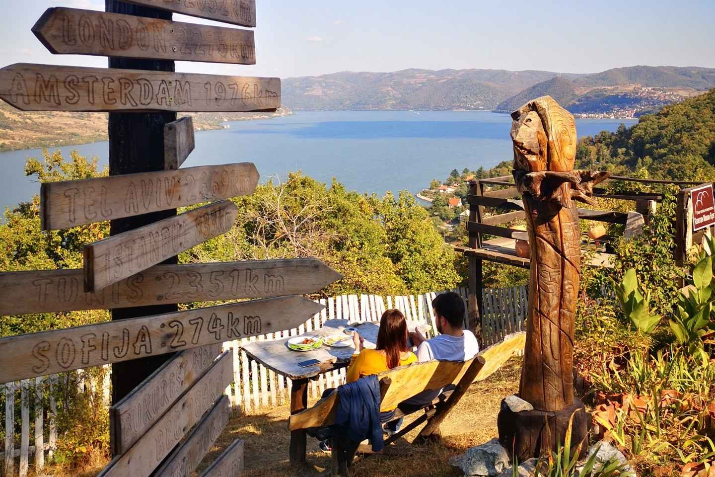 Tanke neue Energie im Kapetan Mišin Breg Öko-Etho-Komplex. Hier genießt du atemberaubende Ausblicke auf die Djerdap-Schlucht und erkundest die Freiluftgalerie "Mensch, Holz, Wasser", die einzigartige Holz- und Steinskulpturen präsentiert, inspiriert von der Natur.