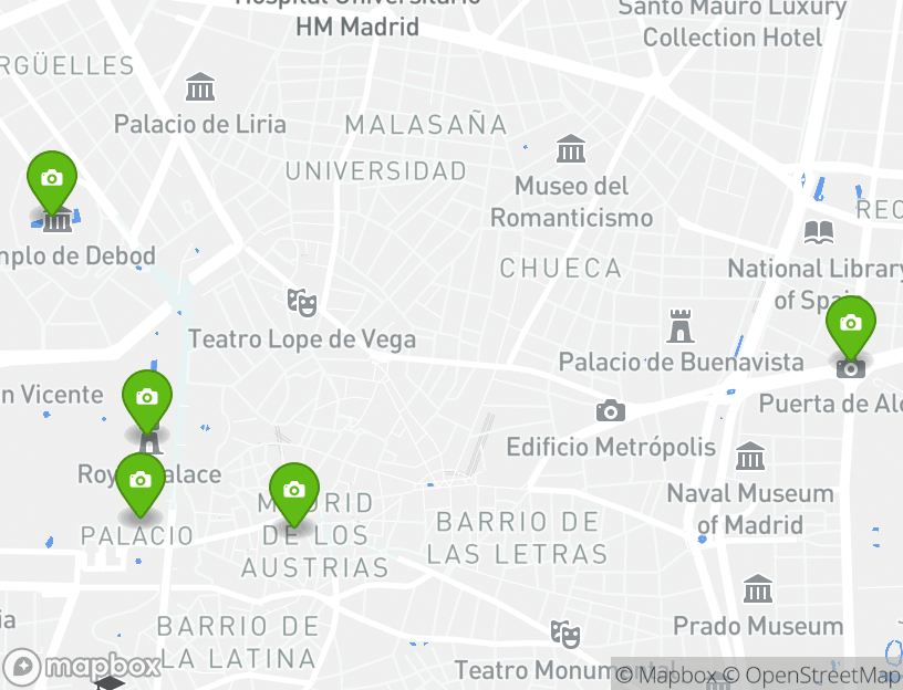 Sabatini Gardens (Jardines de Sabatini), Royal Palace of Madrid (Palacio Real de Madrid), Almudena Cathedral (Catedral de la Almudena), San Miguel Market (Mercado de San Miguel), and Cibeles Fountain (Fuente de Cibeles) son algunos de los lugares de interés más populares por los que pasarás, lo que te brinda una oportunidad única de disfrutar de dar un vistazo a estas atracciones favoritas mientras viajas.