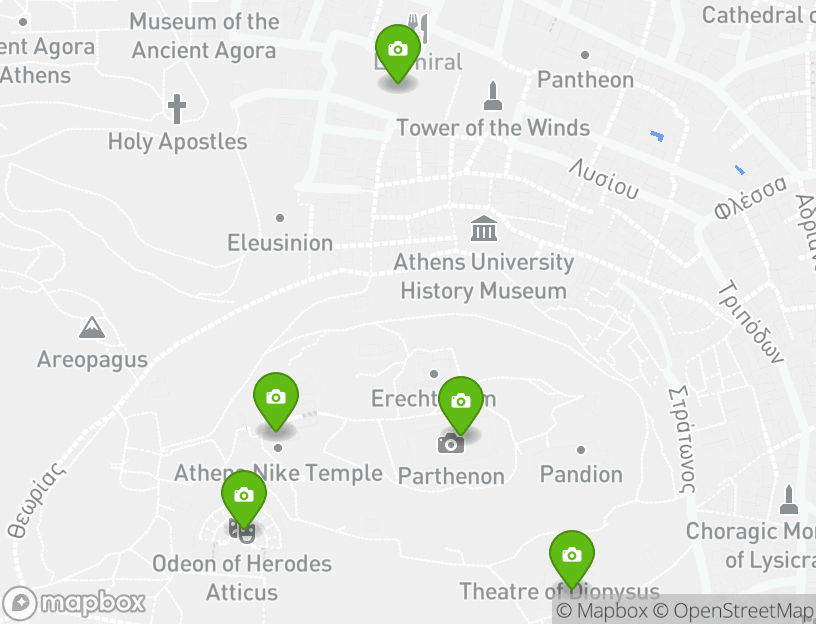 El punto de partida de esta actividad es Dionysiou Areopagitou 3. Durante tu aventura, verás algunas de las principales atracciones locales. Algunas de las atracciones más destacadas de este itinerario son Acropolis, Parthenon, and Agora of Athens. Cerca de allí, Atenas ofrece algunos de los mejores destinos turísticos locales. Agora of Athens and Temple of Athena Nike son algunos de los sitios favoritos que no querrás perderte.