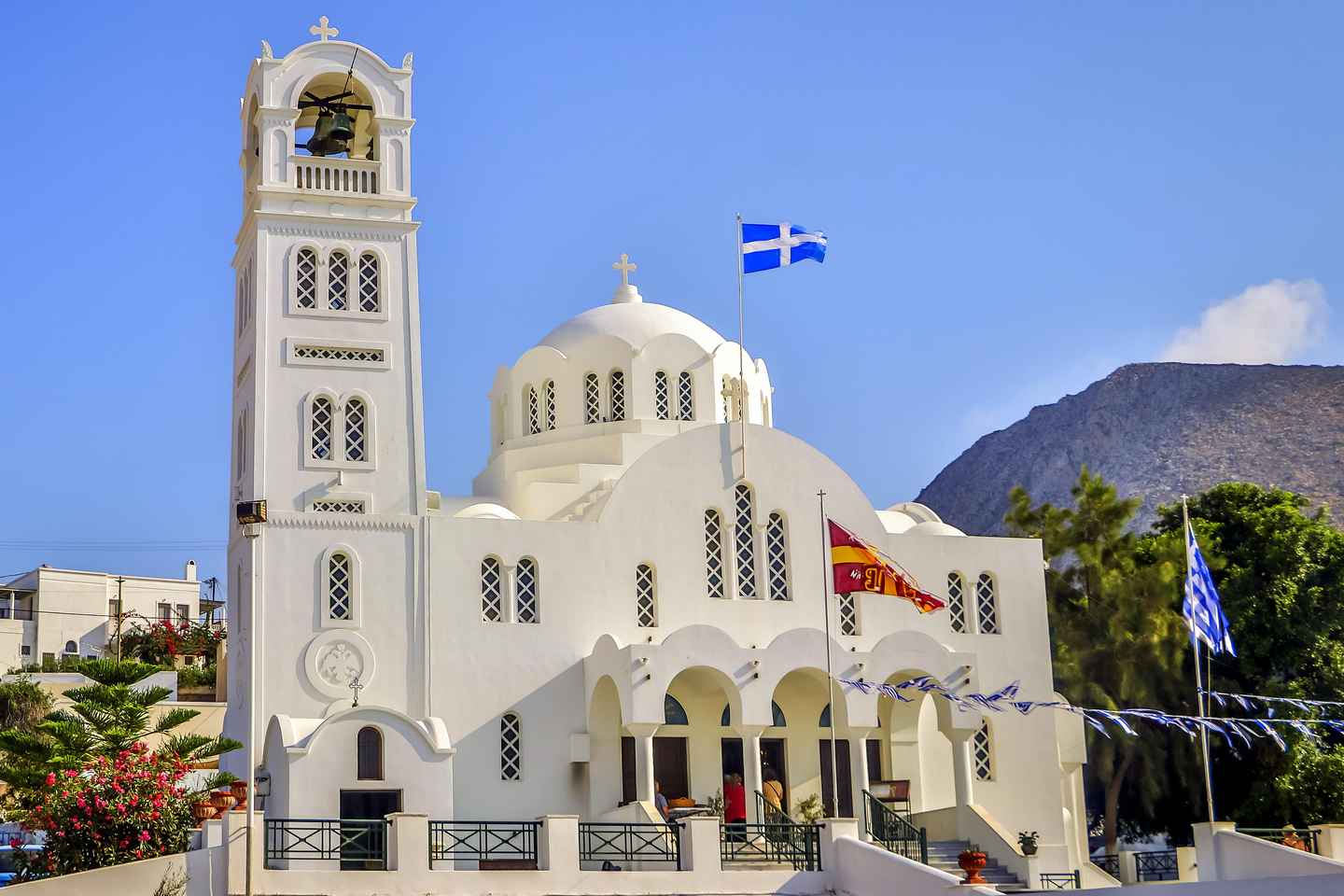 A la llegada, un cómodo autobús con aire acondicionado te espera para llevarte a un recorrido por las joyas de Santorini. Comienza en Firostefani, donde podrás apreciar la reconocida cúpula azul, y explora los bulliciosos mercados de Oia para encontrar recuerdos únicos.