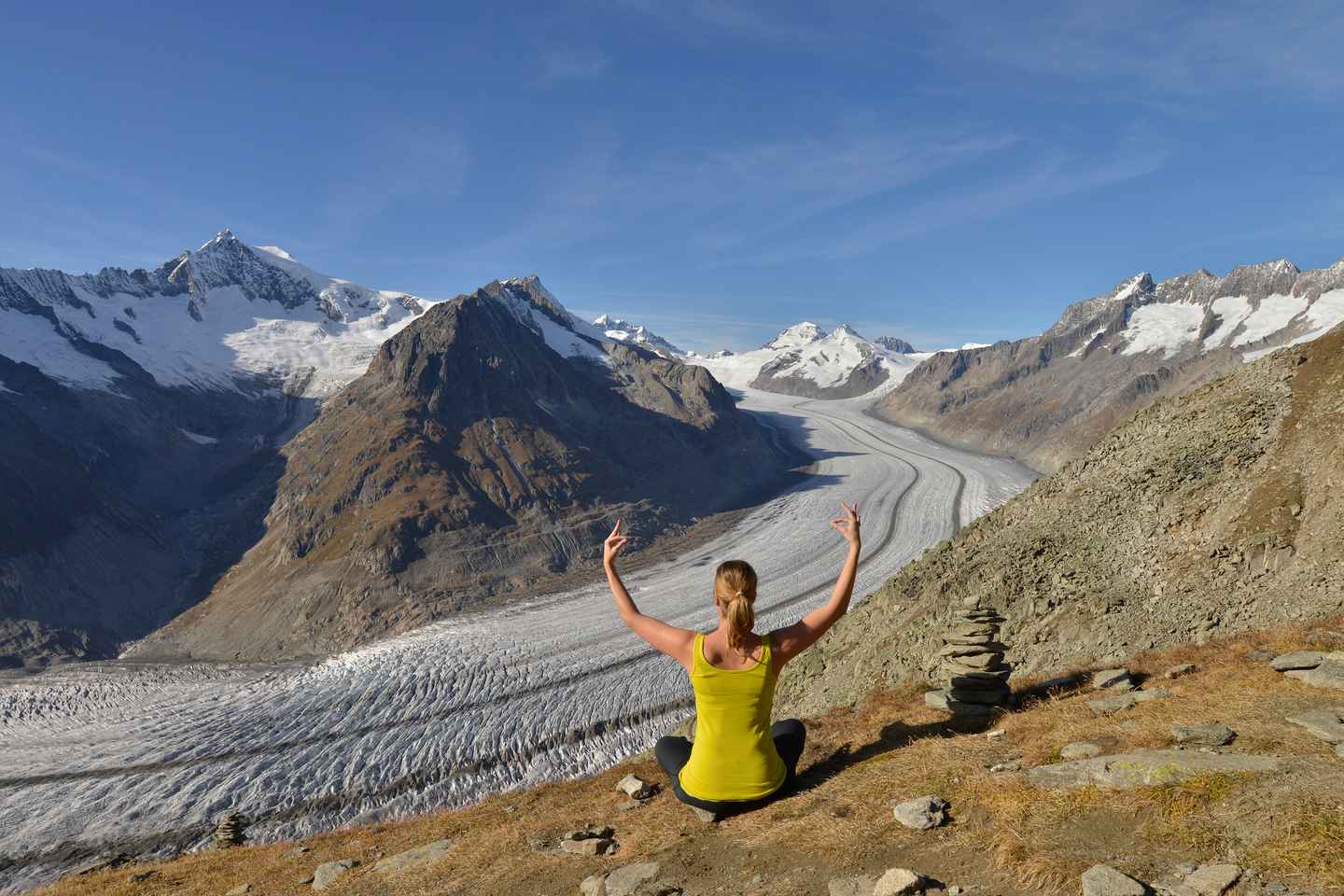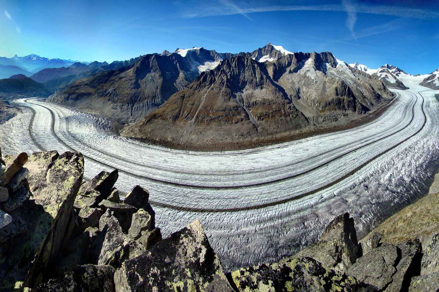 Al llegar a la cima del Eggishorn, presencia la grandeza del Gran Glaciar Aletsch desde una plataforma impresionante. Maravíllate con los picos icónicos del Eiger, Mönch, Jungfrau y Matterhorn mientras disfrutas de la belleza del Sitio del Patrimonio Mundial de la UNESCO.