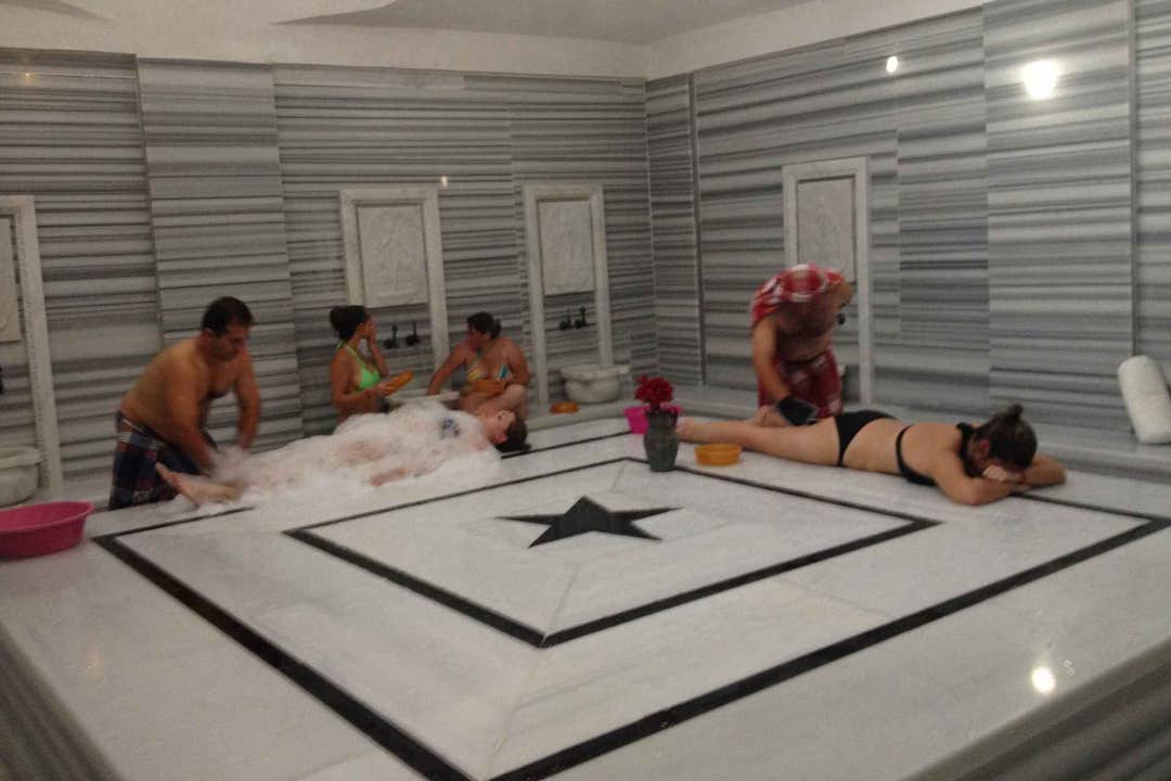 Recuéstate sobre una losa de mármol calentada mientras un asistente experto realiza una exfoliación refrescante con un guante áspero, revitalizando tu piel. Después, enjuágate y disfruta de un lujoso masaje con espuma de jabón de aceite de oliva tradicional, aliviando la tensión muscular y promoviendo la relajación.