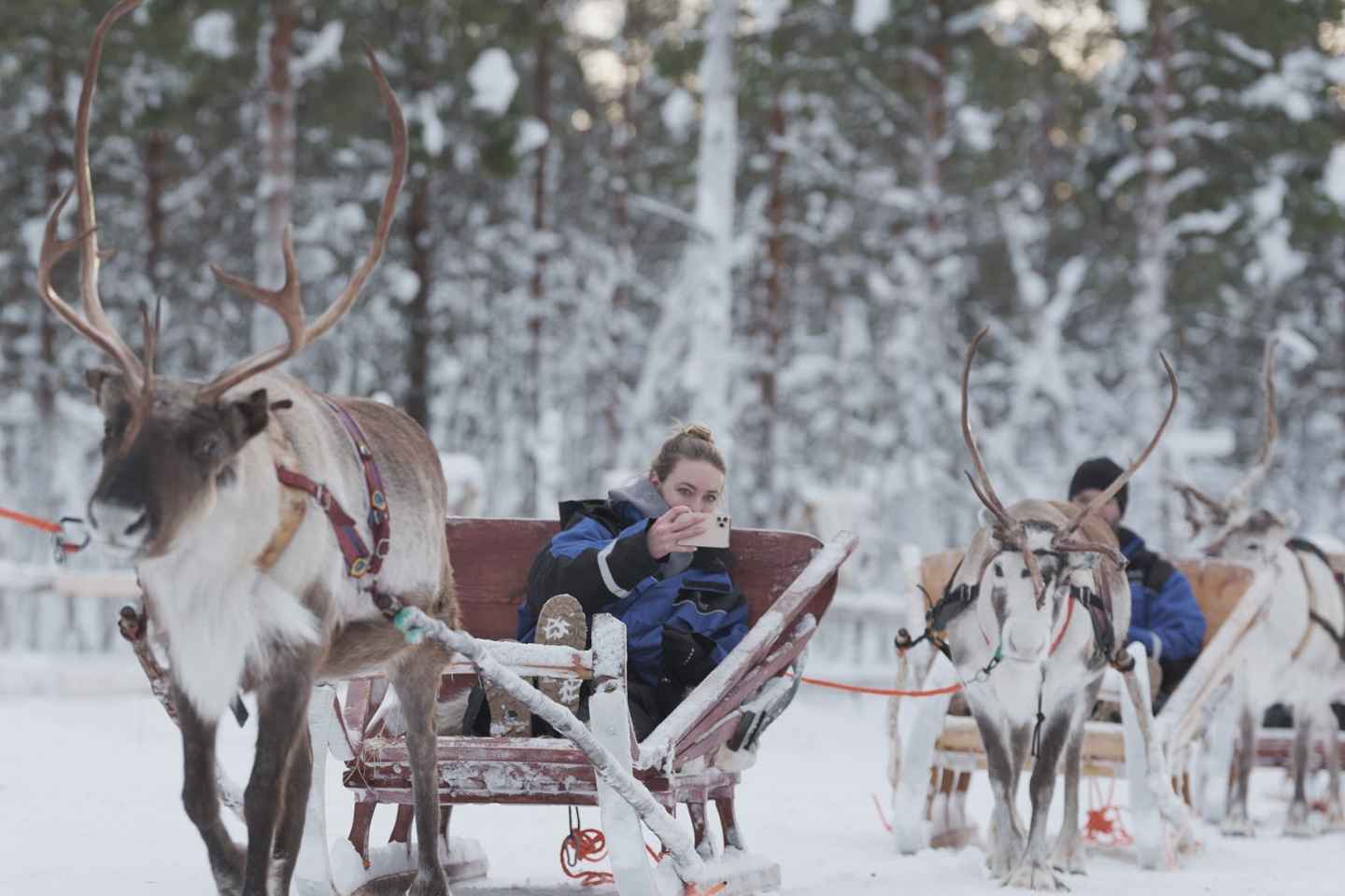 After the excitement of the husky ride, slow down and relax as you glide through the tranquil Lappish forest in a reindeer-drawn sleigh. The peaceful journey lets you soak in the pristine Arctic scenery and the quiet beauty of the winter landscape.
