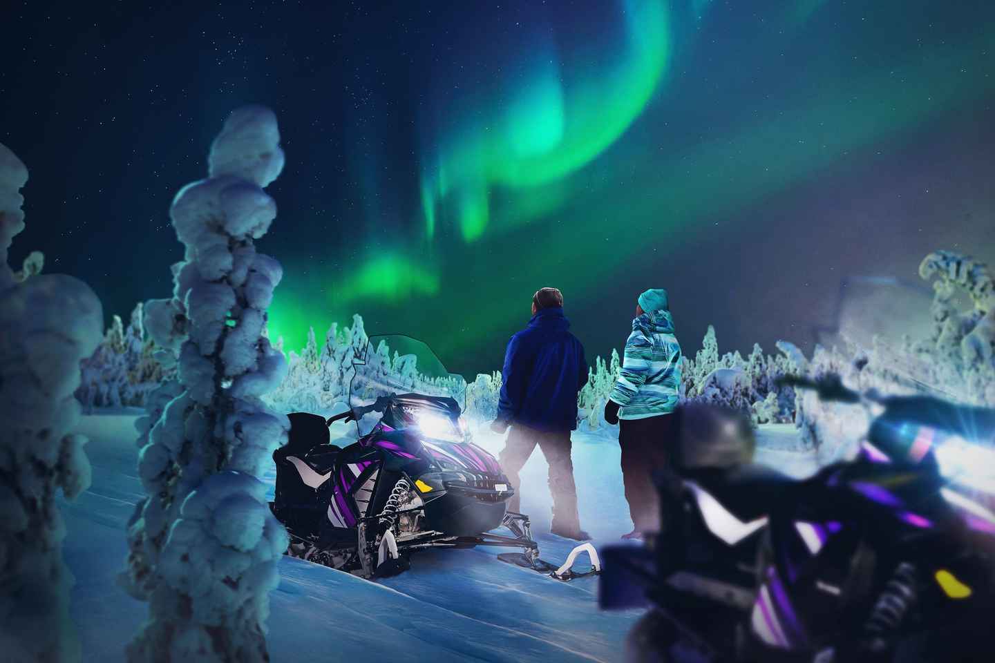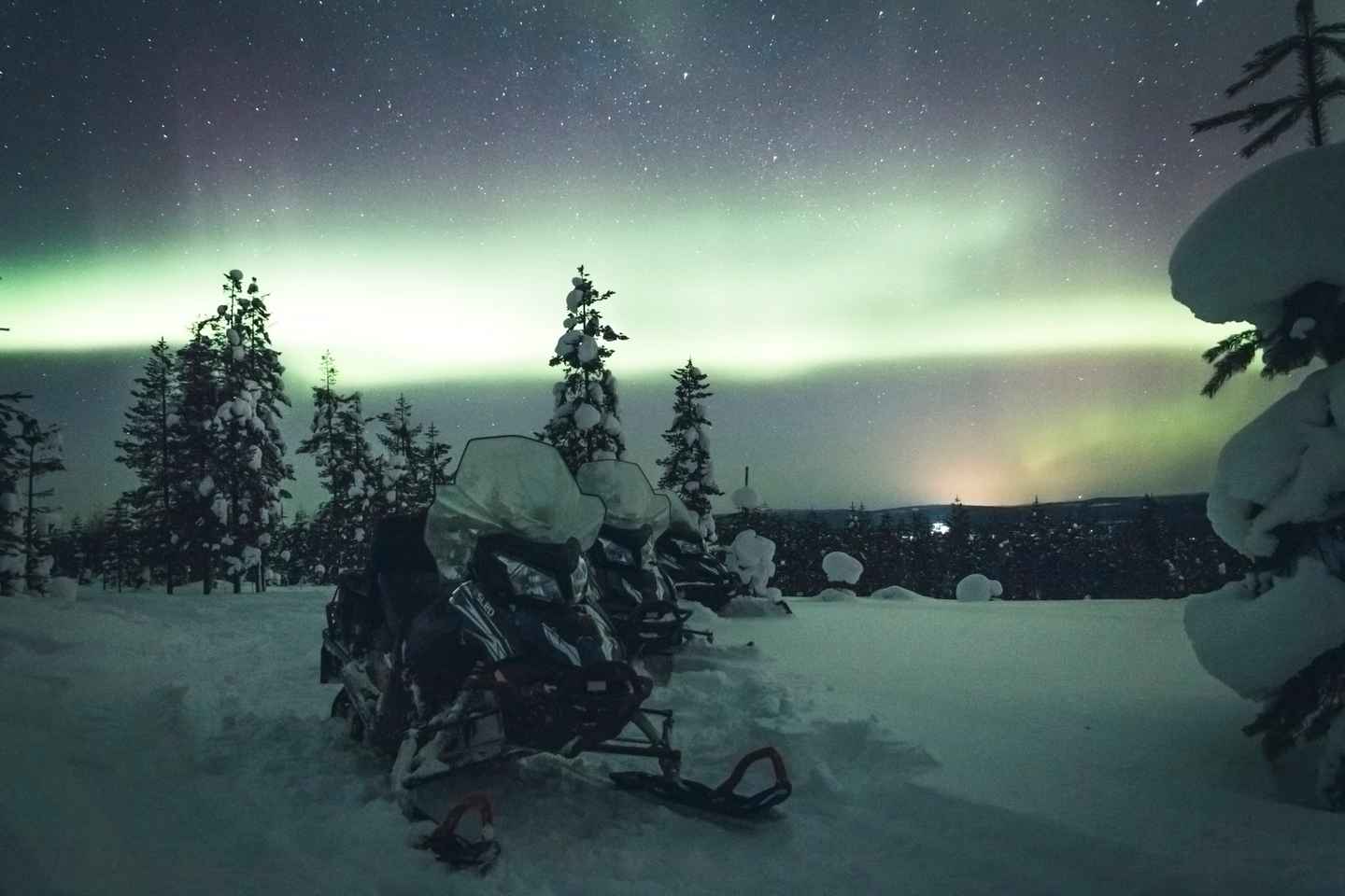 Experience a magical Northern Lights adventure in Rovaniemi, Finland, as you ride innovative electric snowmobiles to a secluded hilltop far from city lights. This eco-friendly journey offers a peaceful escape into Lapland’s pristine wilderness, perfect for those seeking a quiet and sustainable way to witness the Arctic night sky.