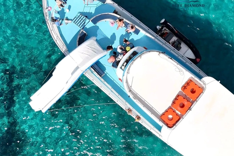 Naviguez pendant 45 minutes en passant devant des sites emblématiques, avec la possibilité de bronzer sur le pont ou de vous détendre à l’intérieur. À l’arrivée au Blue Lagoon, profitez d’une heure complète pour nager et faire du snorkeling dans des eaux cristallines, à proximité des grottes marines de Manolis.