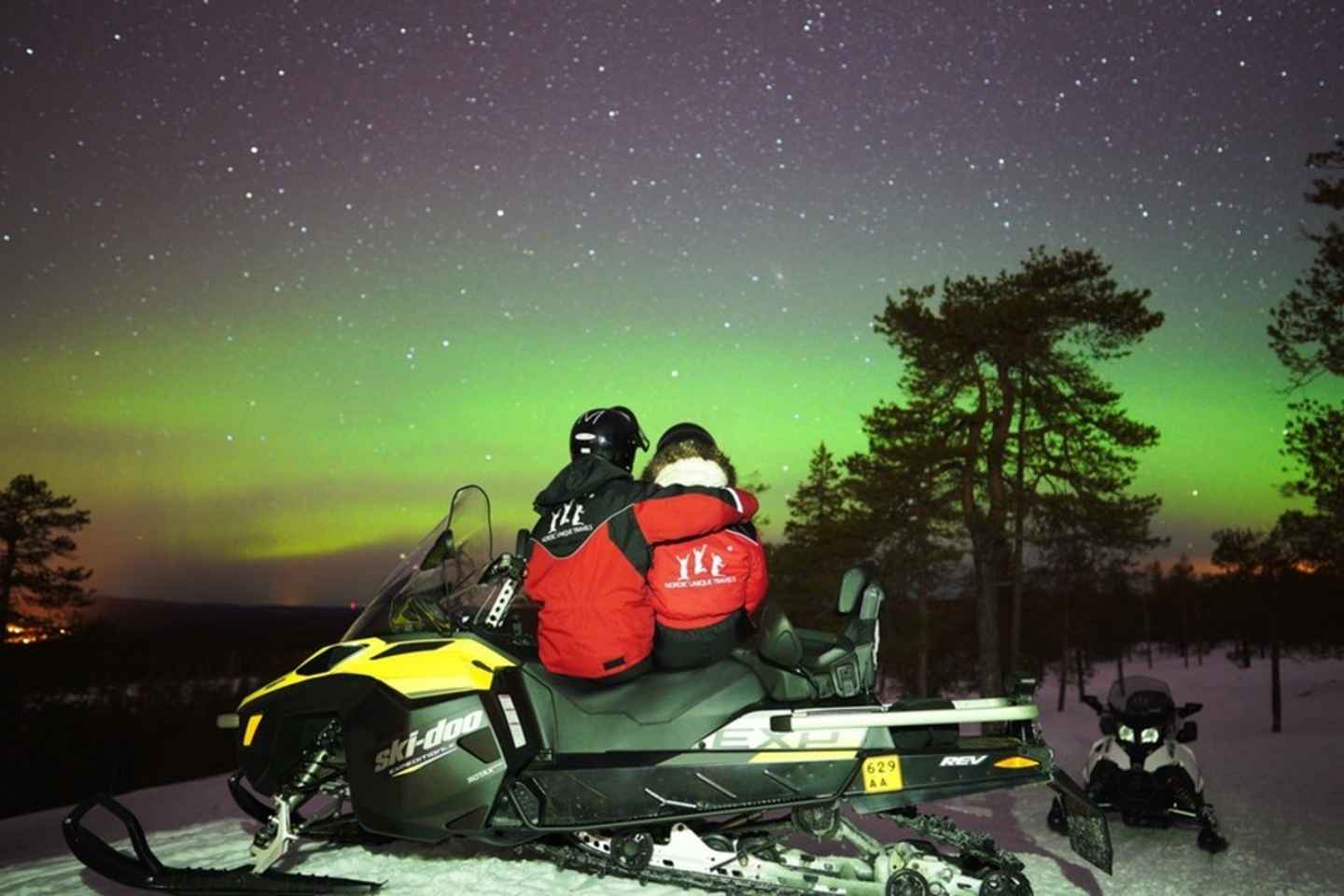 Vivez l'excitation d'une excursion en motoneige à travers les paysages enneigés du nord de la Finlande sous le ciel étoilé de l'Arctique ! Cette aventure offre une manière palpitante d'explorer au-delà des lumières de la ville de Rovaniemi et d'admirer les fascinantes Aurores Boréales.