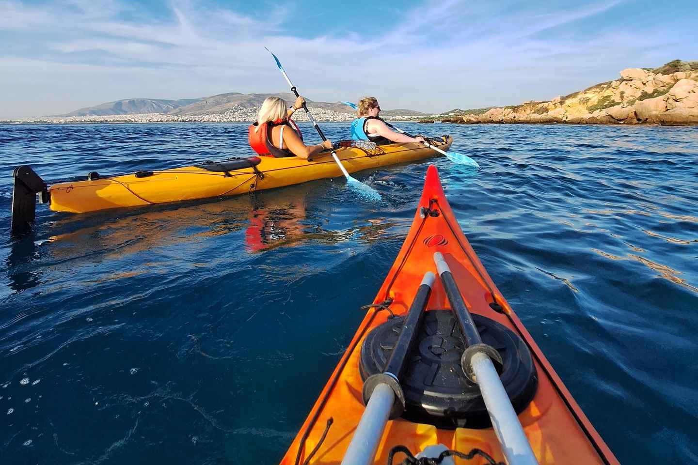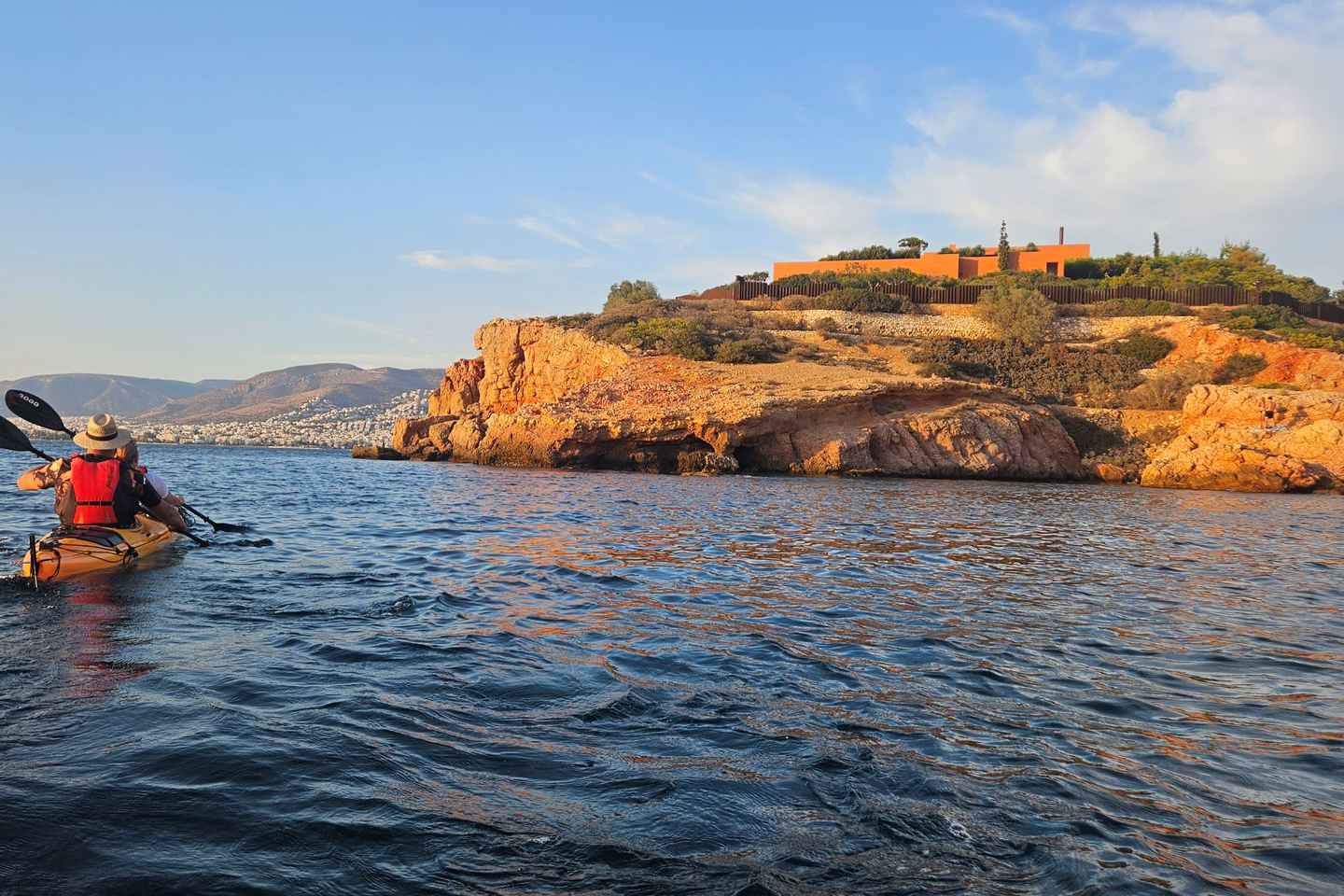 Découvrez la beauté d'Athènes depuis la mer lors d'une aventure en kayak au coucher du soleil ! Pagayez le long de la fascinante côte, idéale pour les débutants, sur une distance douce de 2,5 km, que ce soit en formule partagée ou en tour privé.