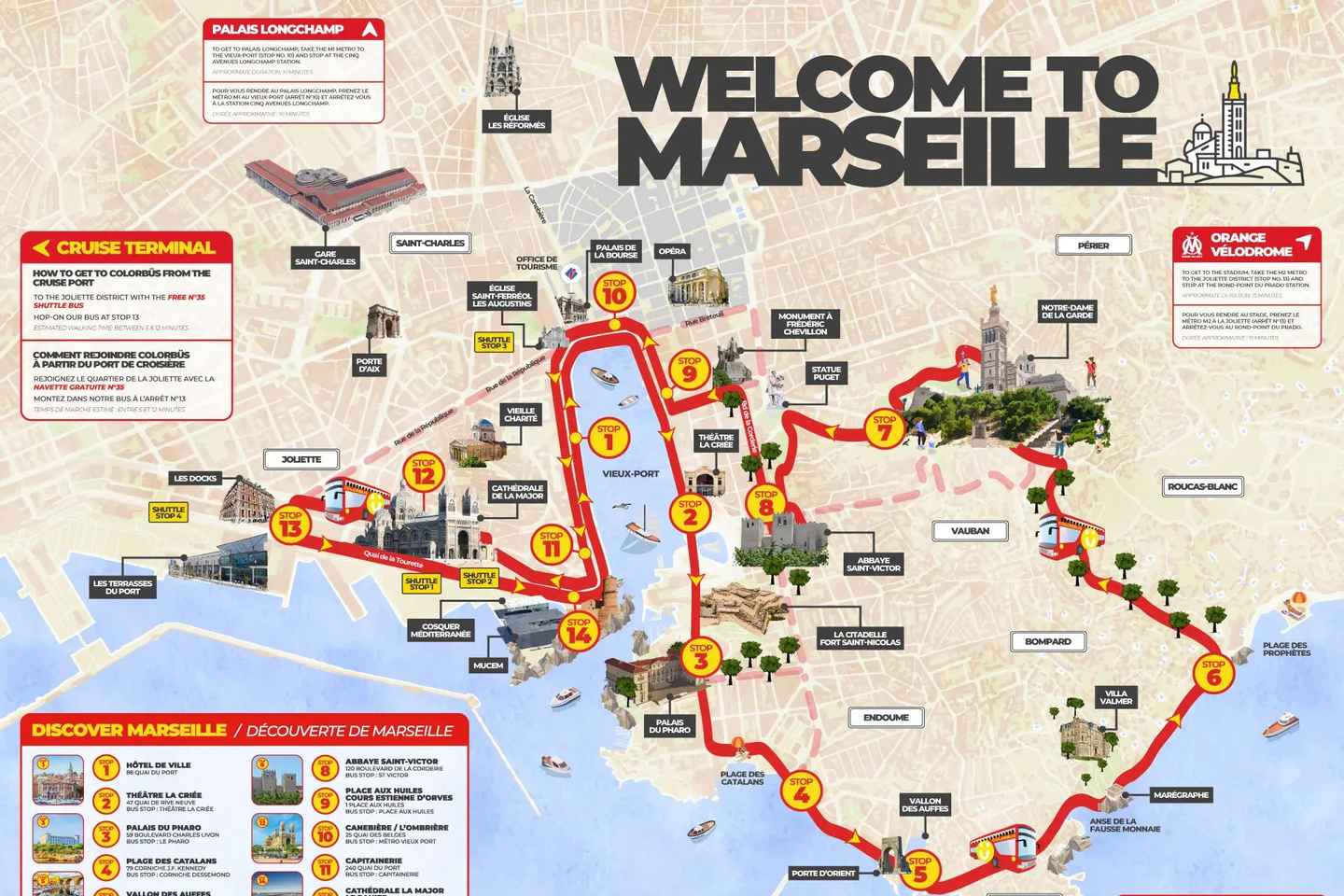 Board a comfortable panoramic bus at the Old Port, just steps from the Town Hall, and set out to discover Marseille’s must-see attractions. The route includes over ten convenient stops, giving you the freedom to visit sites like La Major Cathedral, the picturesque Vallon des Auffes, and the innovative Mucem museum.