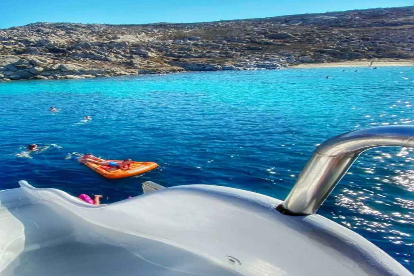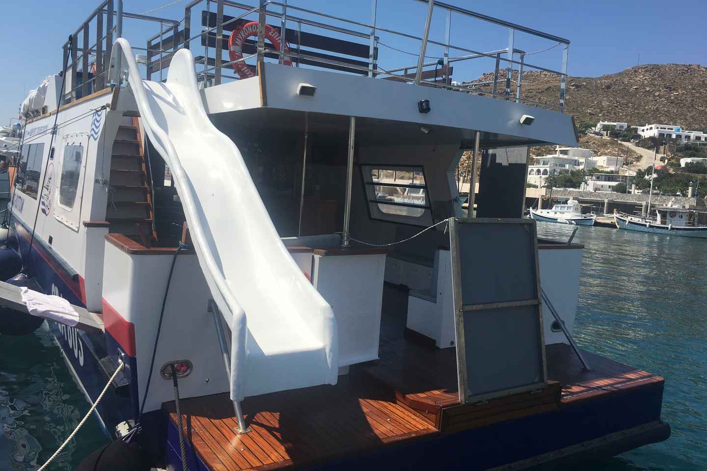 After your visit to Delos, continue to the tranquil, uninhabited island of Rhenia. Here, you can swim in crystal-clear waters, lounge on sandy beaches, and take in the stunning scenery. The boat is equipped with a paddle surfing board and a water slide, ensuring hours of fun for all ages.