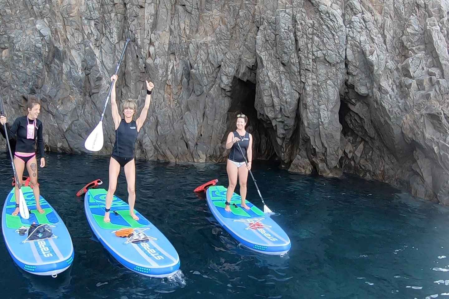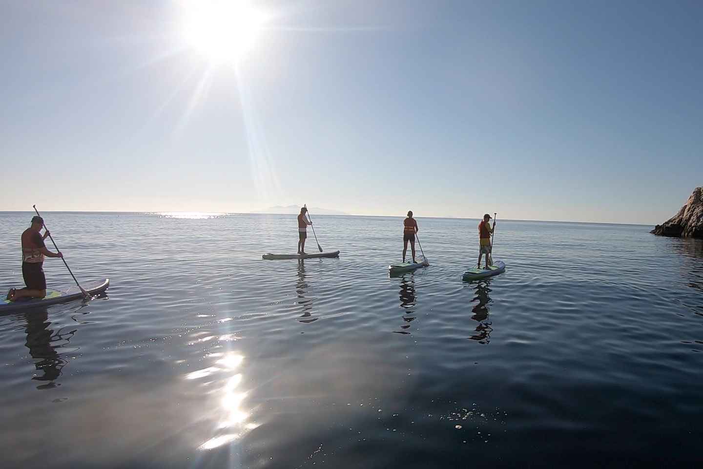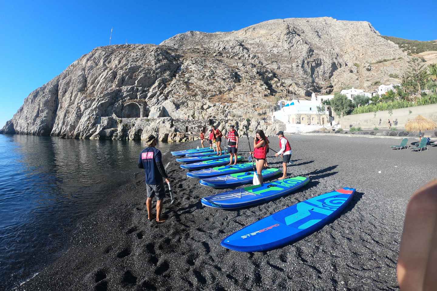 Experience the thrill of stand-up paddleboarding along the dramatic coastline of Santorini, Greece, as you glide across crystal-clear waters. Your adventure begins with a warm-up and safety session led by a friendly guide, ensuring you feel confident before heading out onto the sea.