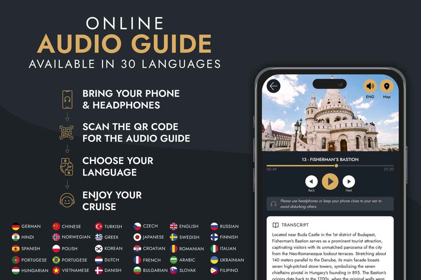 Enhance your sightseeing experience with an online audio guide available in 30 languages, accessible directly from your phone. You’ll find fascinating stories and insights about Budapest’s most important sights, from the majestic Parliament building to the charming Taban district. Don’t forget to bring your own earphones for the best audio experience.