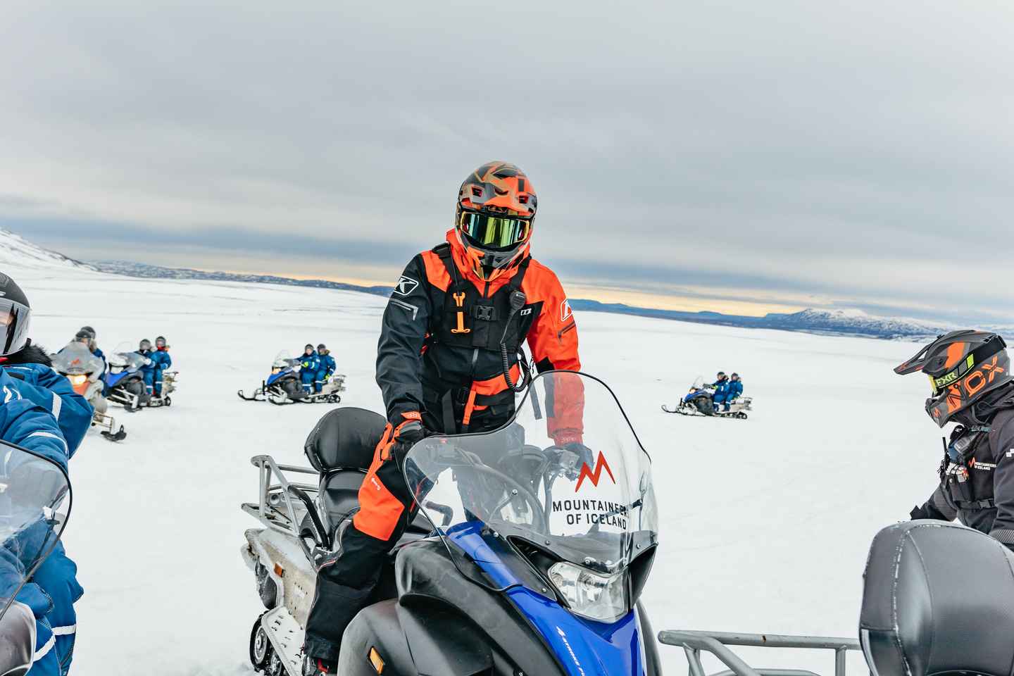 Adventure intensifies as you board a custom super truck to reach the Langjökull Glacier base camp. Gear up with provided helmets, gloves, and snowsuits before setting off on a thrilling snowmobile ride across the glacier’s endless ice fields, guided by local experts for a safe and exhilarating experience.