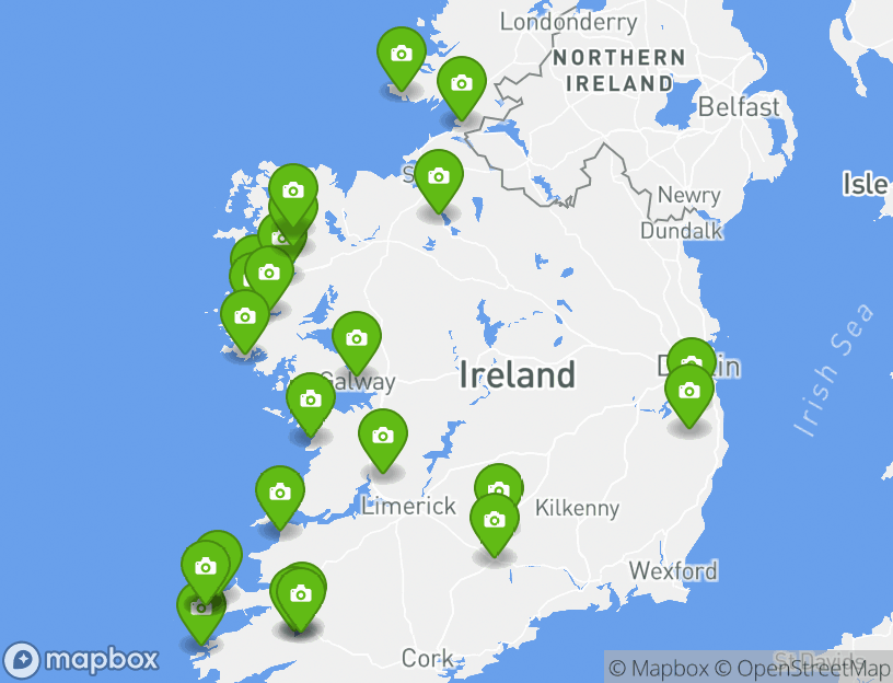 Ballycastle x 1, Donegal x 1, Westport x 2, Clifden x 2, Lahinch x 1, Dingle x 2, Killarney x 2 & Kilkenny x 1