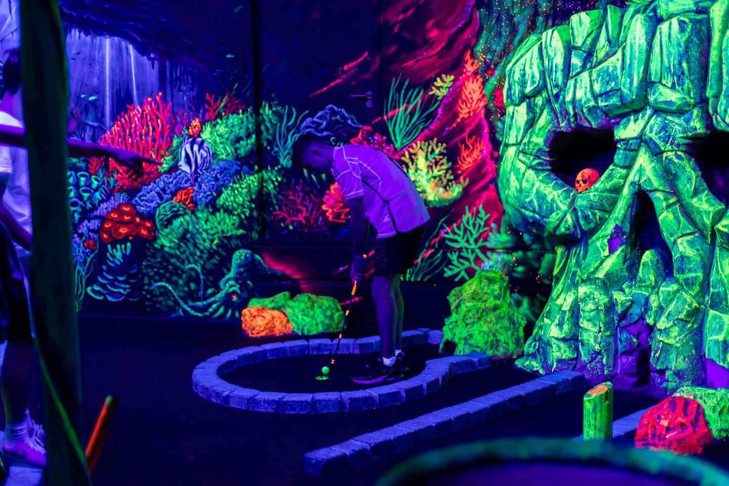 Sigldu um heim með sjávarþema þar sem hitabeltissjóræningjaskip mætast undur neðansjávar. Útfjólublá ljós lýsa upp völlinn, auka við hvert smáatriði og bjóða upp á líflegt ljós í golfupplifun þinni.