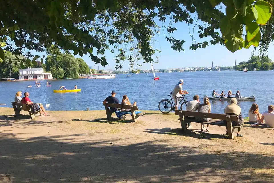 Upplifðu töfra Hamborgar á afslappaðri hjólaferð umhverfis Alster! Þessi fallega ferð leiðir þig um lífleg hverfi eins og Rotherbaum, Pöseldorf, Harvestehude, Eppendorf, Winterhude og Uhlenhorst, þar sem menning og náttúra mætast í fullkomnu samspili. Njóttu þess að sjá glæsilegar sendiráðsbyggingar, stórhýsi og falin tjörn, allt á meðan þú hjólar meðfram kyrrlátum skurðum og fallegum strandlengjum.