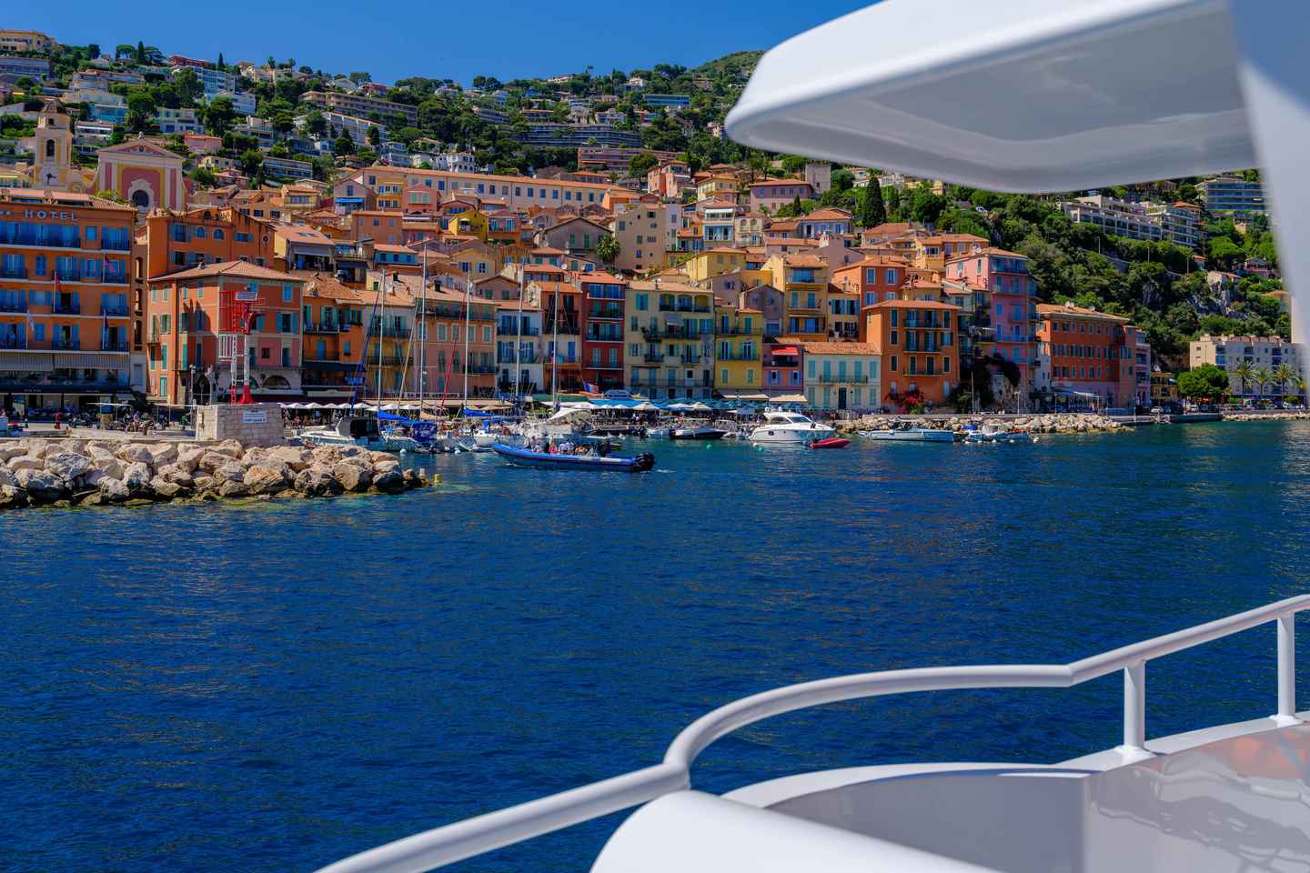 Una volta arrivati a Villefranche-sur-Mer, goditi il vivace porto di pescatori incastonato tra le colline di un pittoresco villaggio. La profondità della baia la rende un ancoraggio sicuro per le grandi navi, aumentando il suo fascino e la sua importanza.