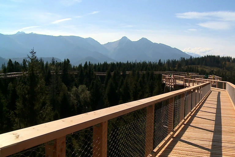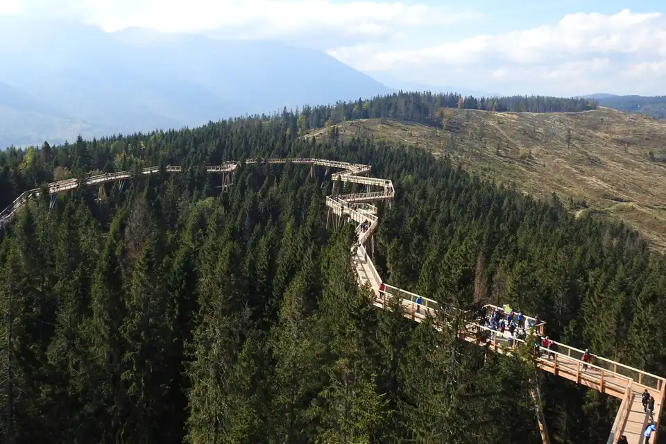 Passeggia lungo il mozzafiato sentiero tra le cime degli alberi, elevato tra 18 e 24 metri sopra il suolo. Vivi l'esperienza di 600 metri di passerelle in legno, che offrono viste spettacolari sui Monti Tatra e il Parco Nazionale Pieniny.