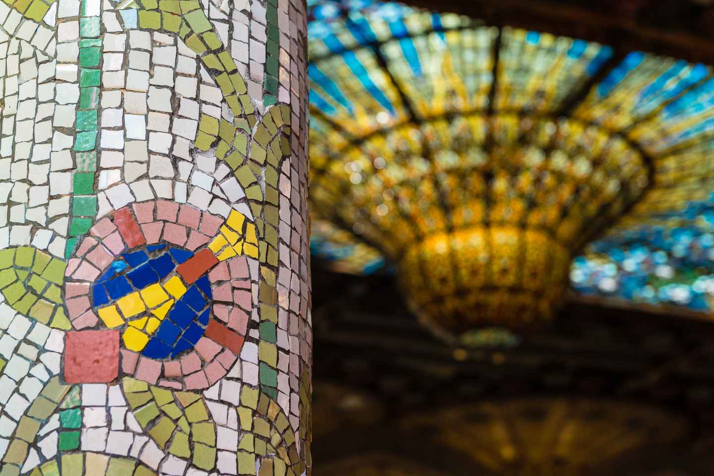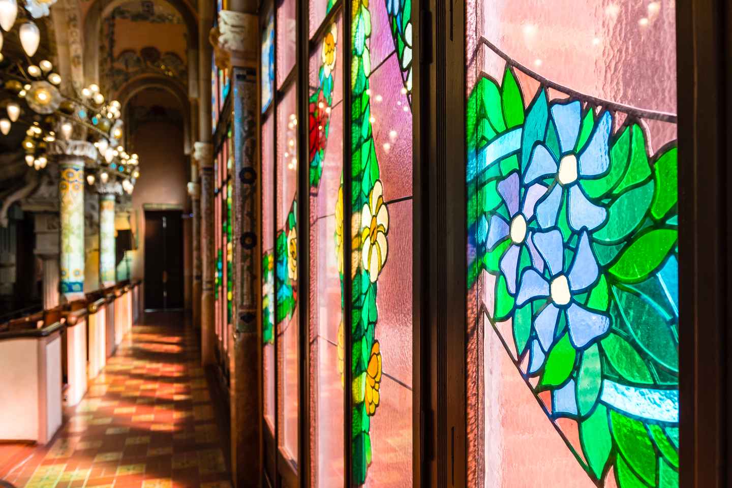 Prosegui verso la Sala Lluís Millet, dove ti aspettano colonne a tema naturale adornate con disegni floreali. Dal grande balcone, goditi una vista unica della fusione armoniosa tra arte e architettura che definisce questo gioiello culturale.