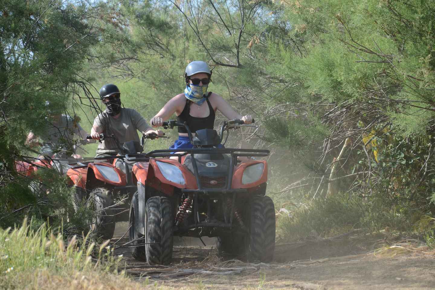 Vivi l'emozione del quad biking nei lussureggianti paesaggi di Kusadasi! Inizia la tua avventura di 3 ore con un comodo pick-up dall'hotel, che ti porterà in un campeggio nel bosco. Qui, una guida professionale ti presenterà i quad e ti illustrerà il percorso emozionante che ti aspetta.