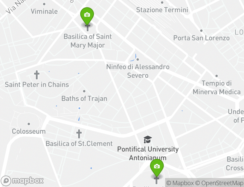 The itinerary includes stops at popular attractions such as Catacombs of Rome (Catacombe di Roma), Basilica of Santa Maria Maggiore (Basilica Papale di Santa Maria Maggiore), Basilica of St. John Lateran (Basilica di San Giovanni in Laterano), and Basilica of Saint Paul Outside the Walls (Basilica di San Paolo Fuori le Mura).