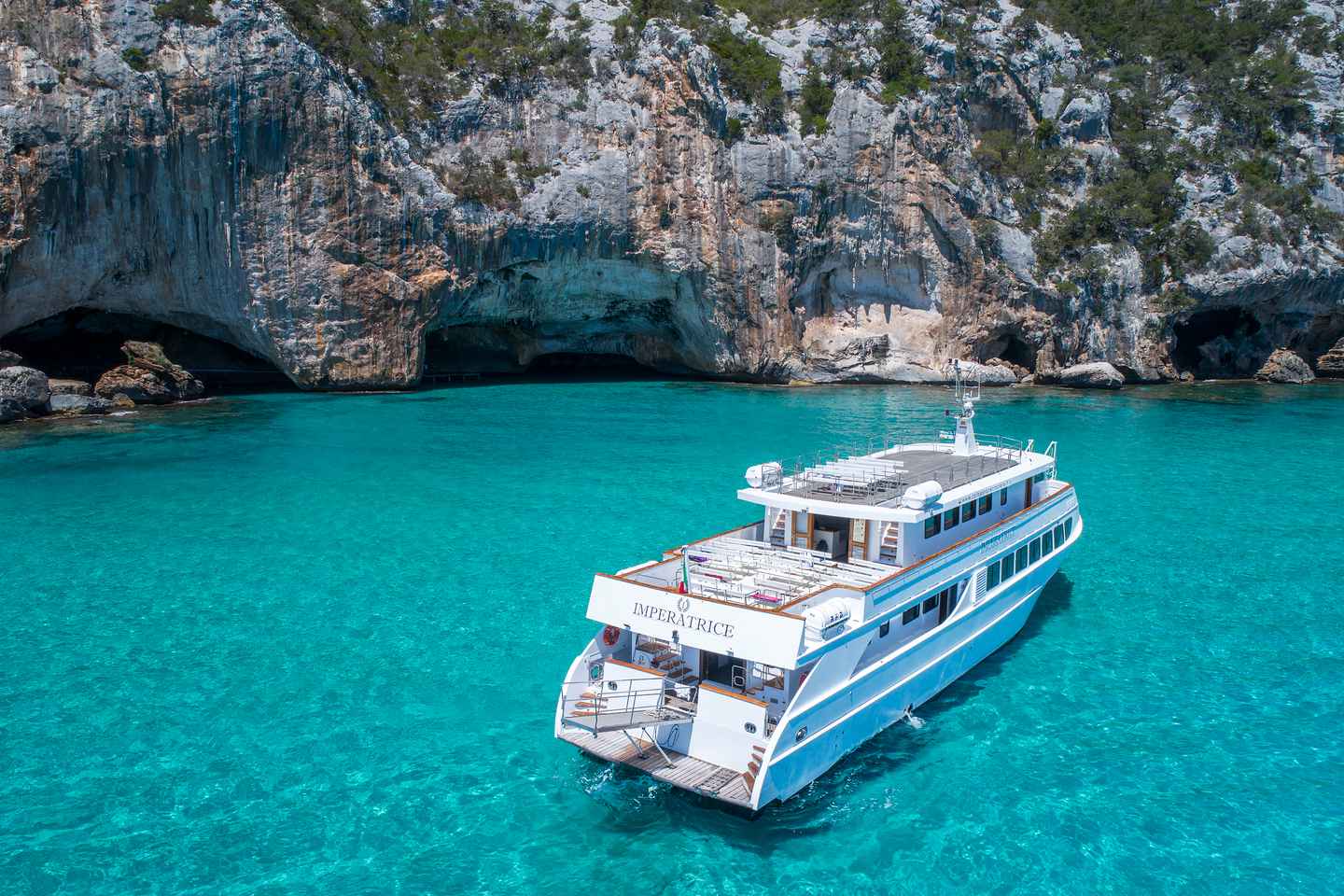 Set sail on a full-day cruise along the stunning Gulf of Orosei in Sardinia, Italy, departing from either La Caletta or Orosei. Relax on the spacious Imperatrice boat, which offers both sunny and shaded decks, as you glide across crystal-clear turquoise waters and take in breathtaking coastal views.