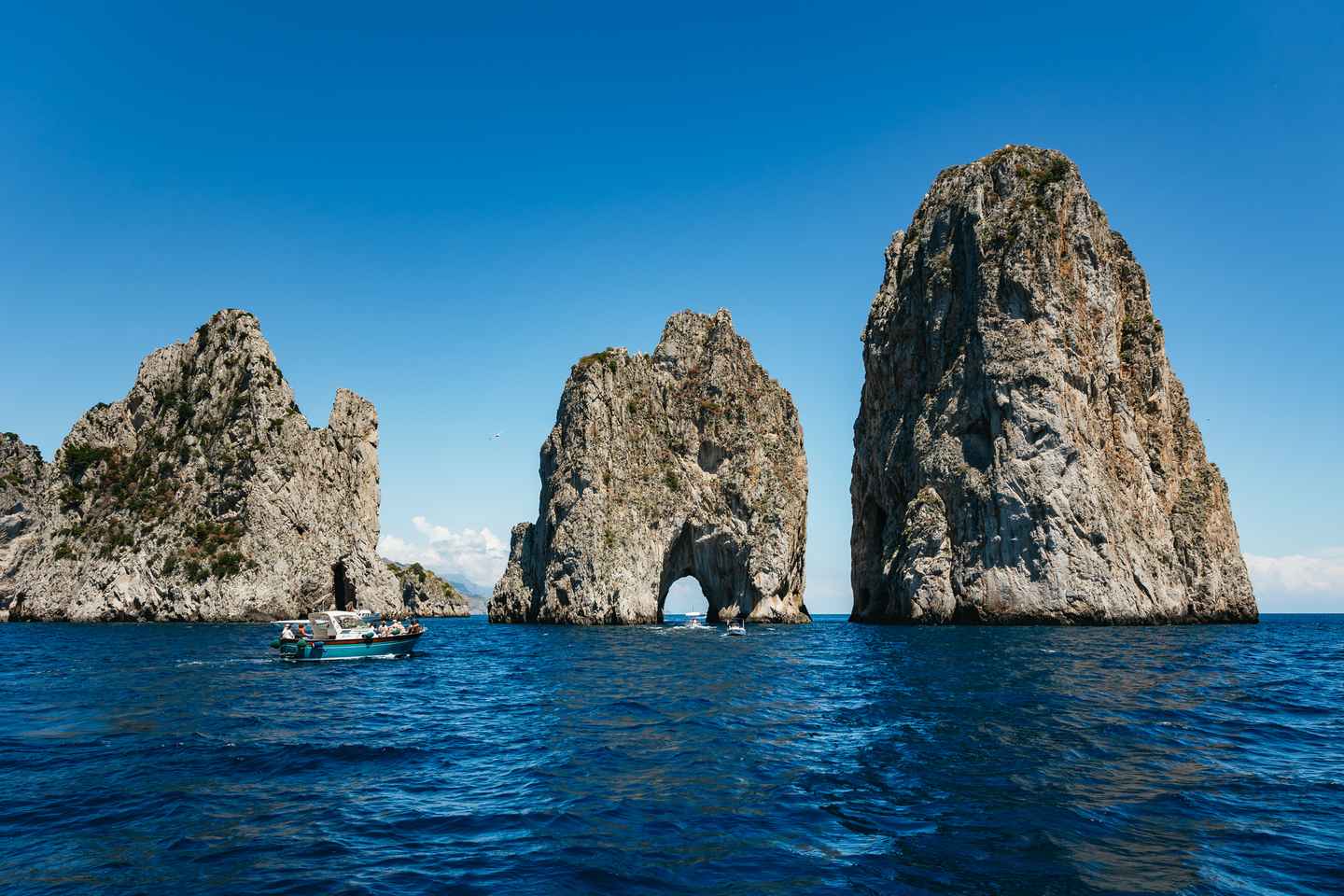 Your journey continues around the island of Capri, where you’ll marvel at the legendary Faraglioni Rocks and the dramatic cliffs of Punta Carena. The tour offers the chance to visit the famous Blue Grotto, depending on sea conditions, with the entrance fee paid on site if you choose to enter.