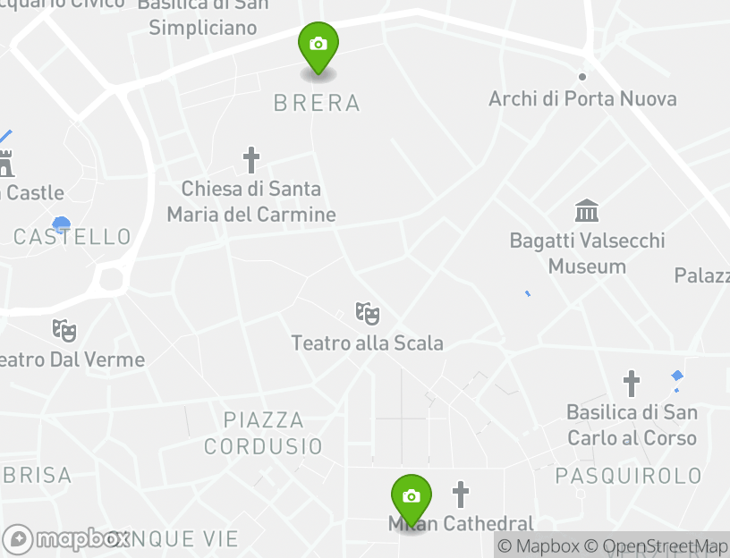 The itinerary includes stops at popular attractions such as Brera Art Gallery (Pinacoteca di Brera), Ambrosiana Museum and Library (Veneranda Biblioteca Ambrosiana), and Museo del Novecento.