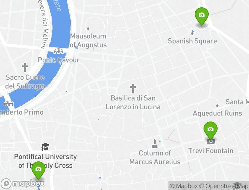 The itinerary includes stops at popular attractions such as Trevi Fountain (Fontana di Trevi), Piazza Navona, and Spanish Steps (Piazza di Spagna).