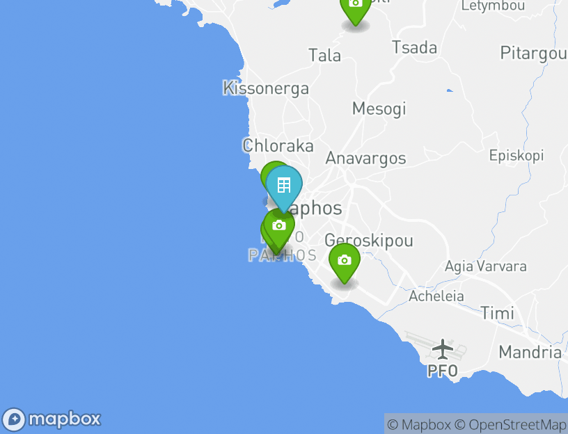 宿泊先からは近隣の多くの人気観光スポットへ簡単に行くことができます。ネア・パフォスはわずか1.7kmの距離にあり、現地で非常に人気の観光スポットなので滞在時にはぜひ足を運んでみましょう。王たちの墓も、この地域で人気の観光スポットで、宿泊先から0.6kmの距離にあります。