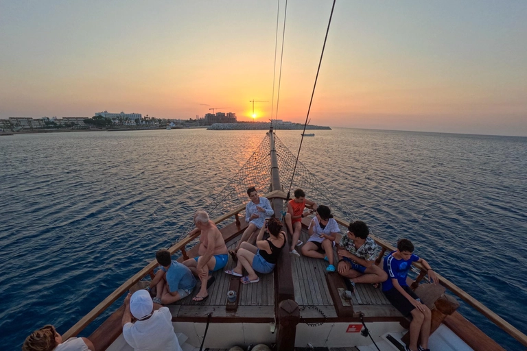 魅力的なサンセットクルーズで、美しいファマグスタ海岸を航海しませんか?伝統的な木製ボートに乗り込み、旅の始まりには爽やかなワインをお楽しみください。謎めいたヴァロシャのゴーストタウンを目撃し、その興味深い歴史を学びながら泳ぎを満喫できます。