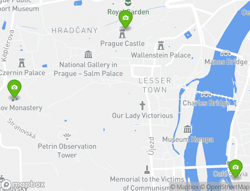 このアクティビティの出発地点はPRAHA BIKEです。探索の途中で、地元の人気アトラクションのいくつかを見ることができます。この旅程のハイライトにはLetná Park (Letenské Sady), Prague Metronome (Prazský Metronom), Prague Castle (Prazský hrad), Strahov Monastery (Strahovský Kláster), and Prague National Theatre (Národní Divadlo)などがあります。近くのプラハには、地元でベストの観光デスティネーションがいくつかあります。