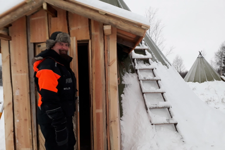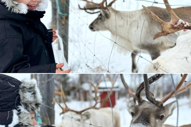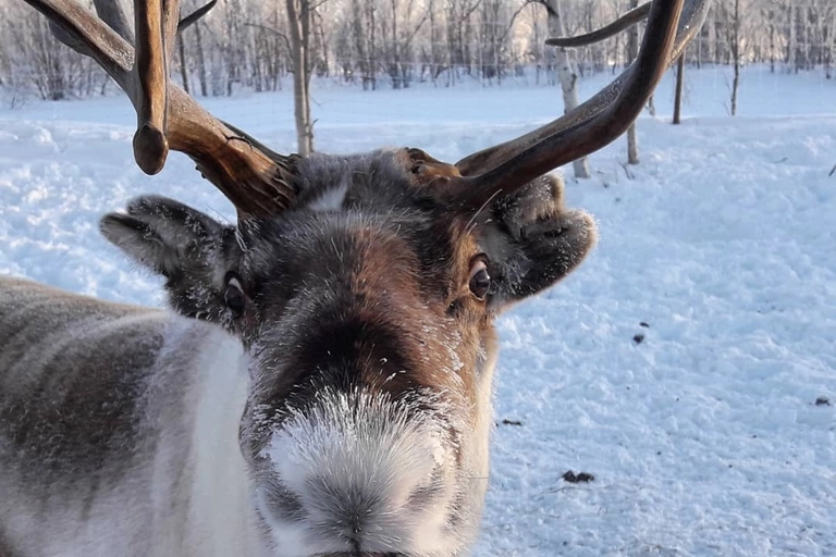 釣りの後は、ティナとタピオの島の家を訪れ、フレンドリーなトナカイとふれあいましょう。地元のトナカイ肉や魚を使ったおいしいランチがラップランドのテントで提供され、ベジタリアンメニューも用意されています。温かい飲み物を味わいながら、静寂に包まれた自然を満喫してください。