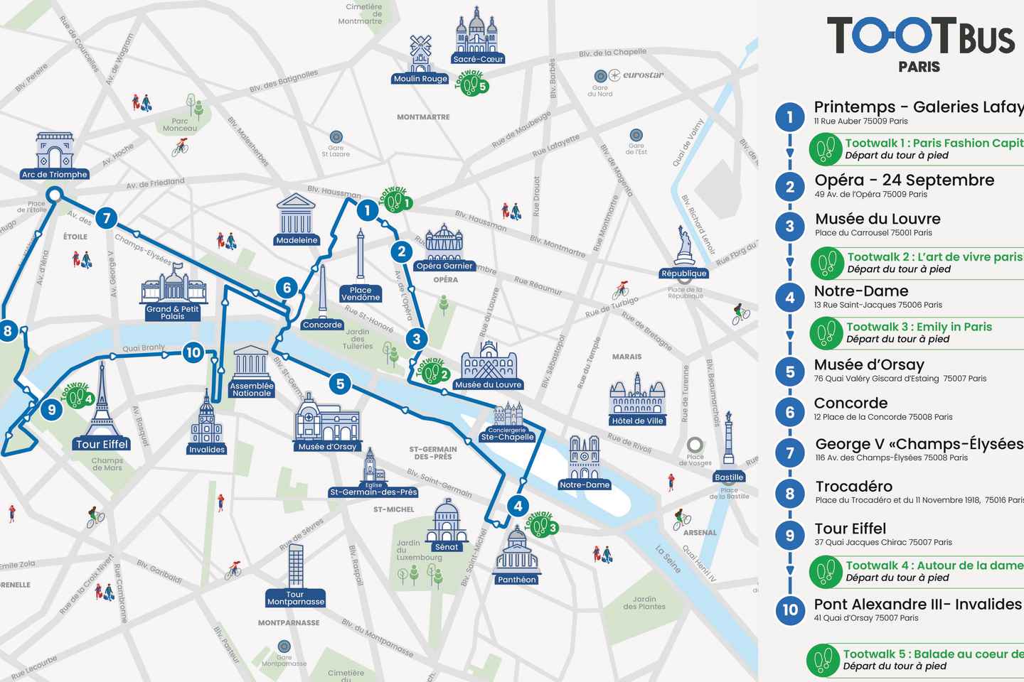 24時間、48時間、72時間のいずれかのチケットを選び、パリの豊かな歴史と活気ある文化を自分のペースで楽しむことができます。清潔なバスは、凱旋門や賑やかなシャンゼリゼ通りなどの主要なランドマークの近くに便利に停車します。
