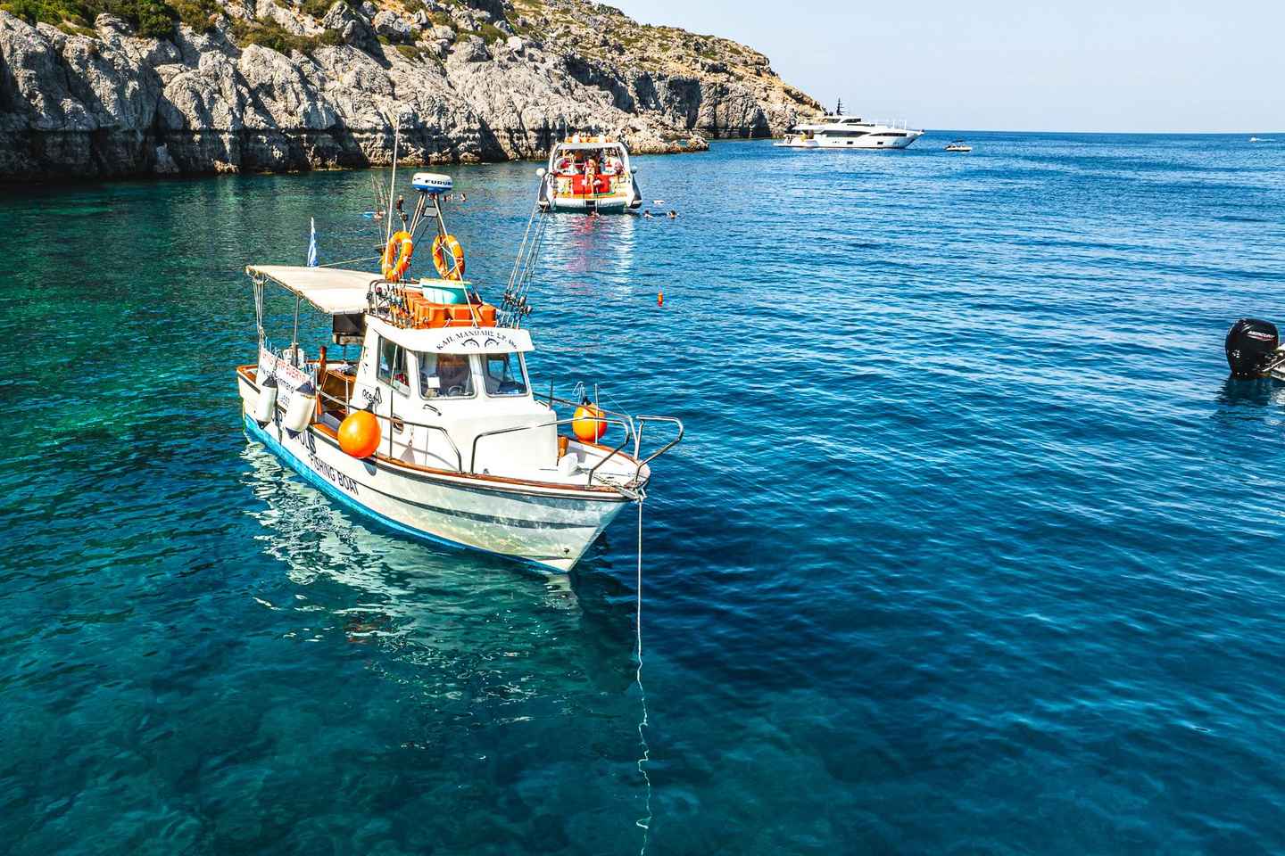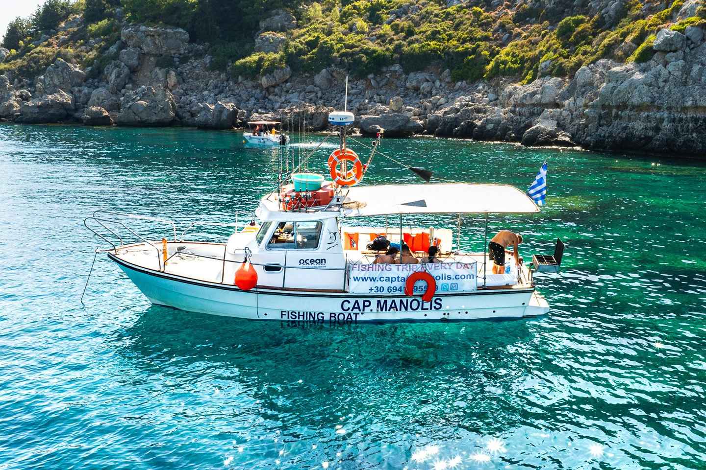釣りを楽しんだ後は、キャプテン・マノリスのボートで新鮮な魚を使った美味しいBBQランチまたはディナーをお楽しみください。ロドスの有名なランドマークや美しいビーチを眺めながらのお食事は格別です。透き通った海では、泳いだりシュノーケリングをしたりと、思い思いの時間をお過ごしいただけます。