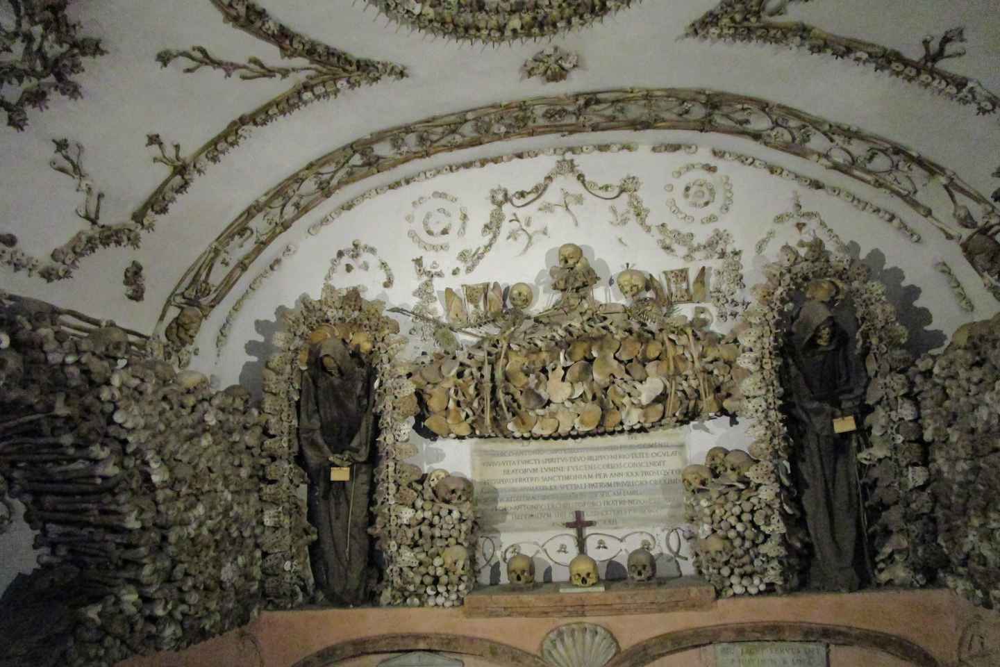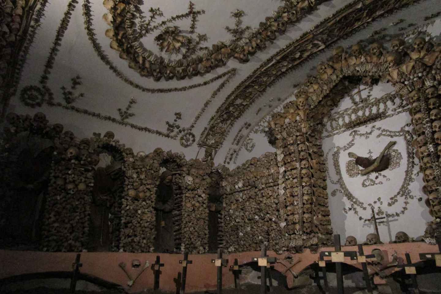 다리뼈와 허벅지 뼈의 지하실로 투어를 이어가세요. 골반의 지하실에서 평화로운 장면을 감상하고 카푸친 수도사들의 무덤을 표시하는 상징적인 십자가를 주목하세요.