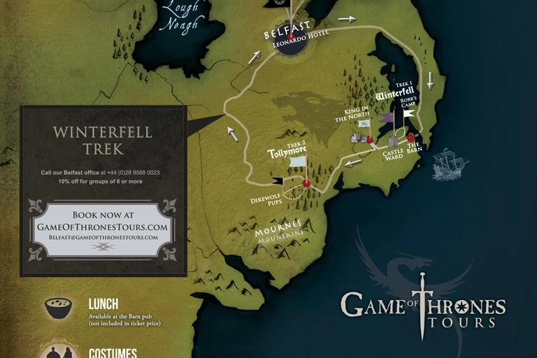 The final stop is the enchanting Tollymore Forest Park, the setting for the Night's Watch's first encounter with the White Walkers and the discovery of the direwolf pups. Your return journey brings you back to the Leonardo Hotel in Belfast after a day filled with fantasy and exploration. Secure your spot now for a truly unforgettable Game of Thrones experience!