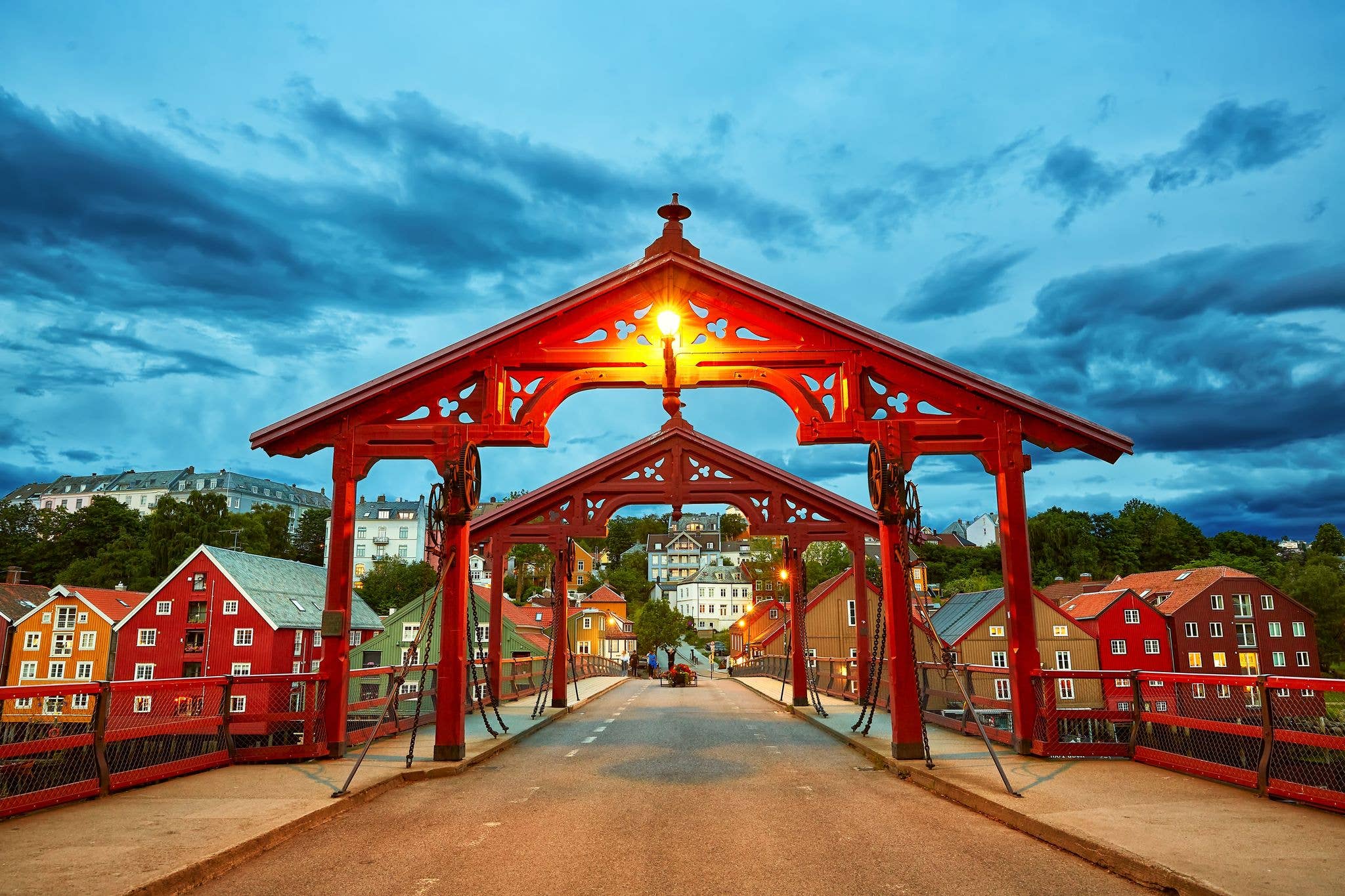 The Old Town Bridge in Trondheim, often referred to as the "Gateway to Bakklandet," offers more than just a passage across the Nidelva River. One of its most striking features is the "Lykkens portal" or "Portal of Happiness," a pair of ornate wooden arches that majestically frame the bridge's entrances. These arches are a favorite spot for photography, capturing both the bridge's charm and the picturesque backdrop of Trondheim's colorful riverside buildings.