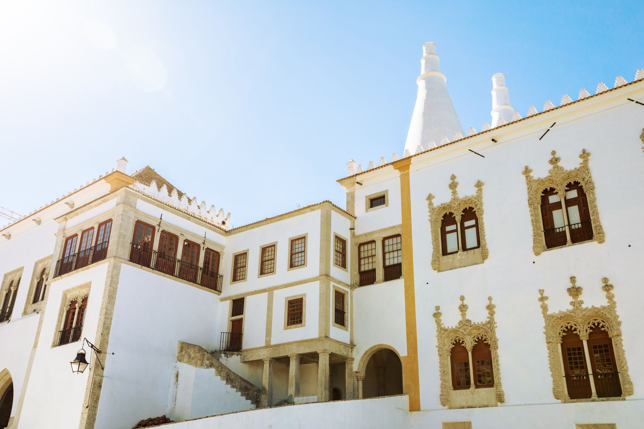 The Sintra National Palace stands out with its iconic pair of conical chimneys, which rise majestically above the landscape. These chimneys, visible from afar, are not only architectural marvels but also a testament to the palace's historical role as a royal kitchen.