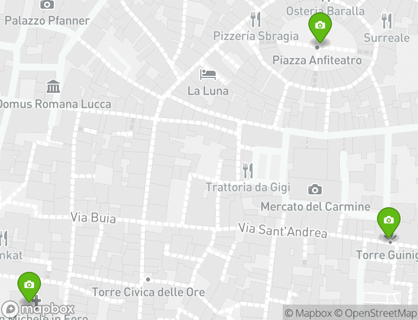 Отправной точкой данного мероприятия является Piazza Santa Maria. Во время этого приключения вы увидите лучшие из местных достопримечательностей. Среди основных моментов, включенных в этот маршрут, — Walls of Lucca (Mura di Lucca), Lucca Cathedral (Duomo di Lucca), Church of San Michele in Foro (Chiesa di San Michele in Foro), Guinigi Tower (Torre Guinigi), and Piazza dell'Anfiteatro. Неподалеку отсюда Лукка предлагает посетить одни из лучших местных достопримечательностей.