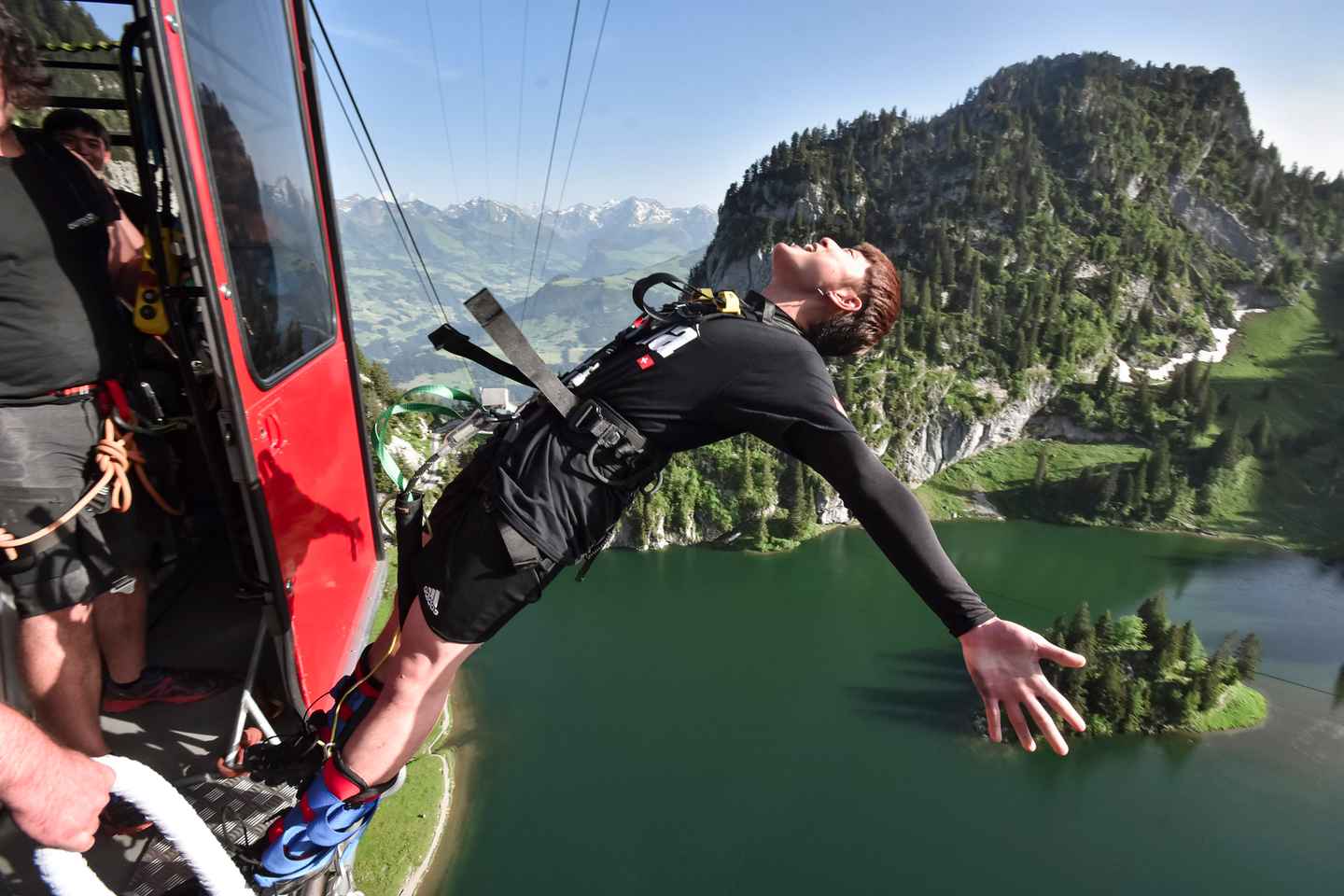 Познакомьтесь с вашим опытным гидом, который позаботится о вашей безопасности перед прыжком. Поднимитесь на канатной дороге до промежуточной станции, чтобы вас взвесили и надёжно закрепили. Затем поднимитесь ещё выше, чтобы совершить прыжок над спокойным озером Стокензее.