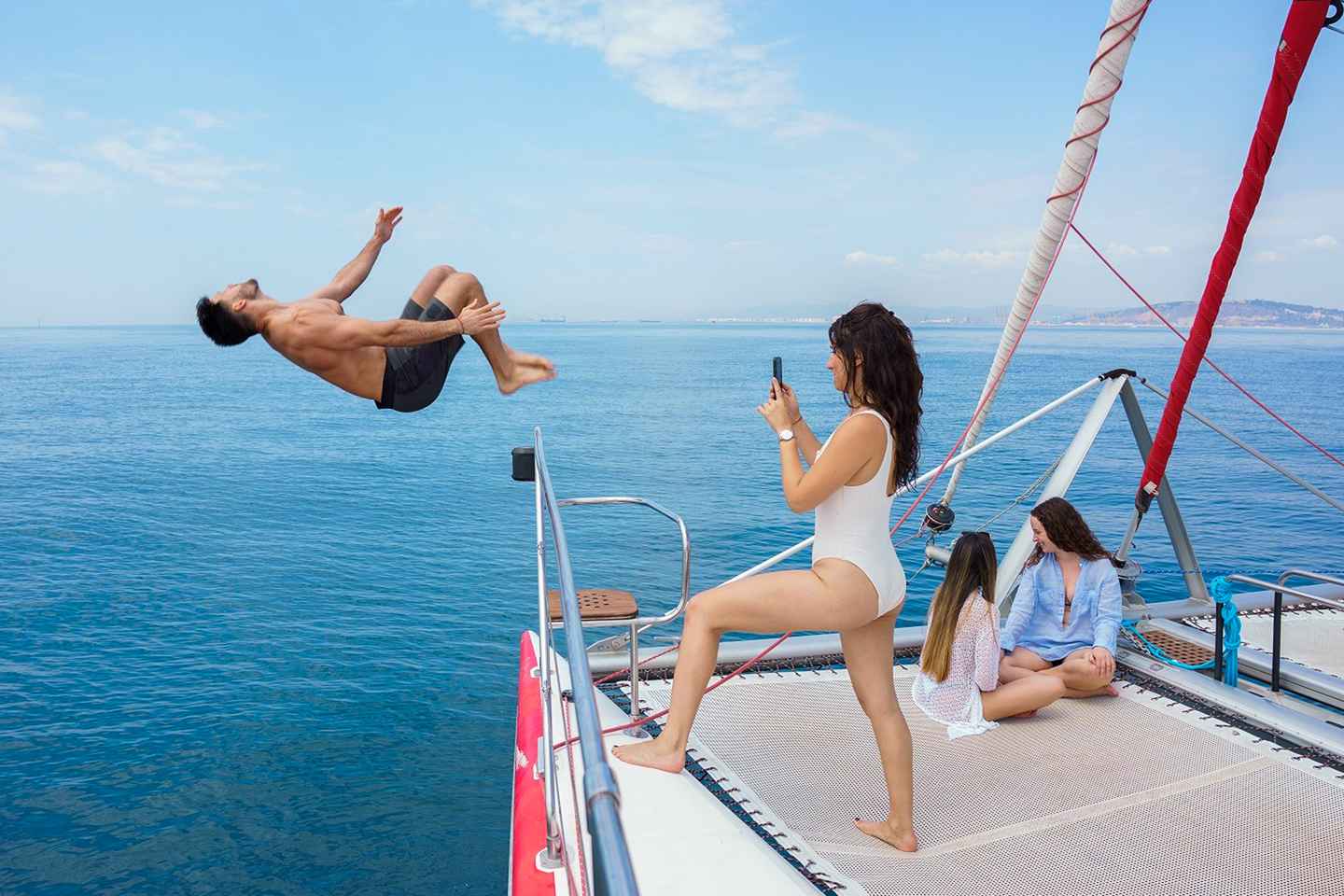 Settle in wherever you like on the spacious catamaran, which comfortably hosts up to 30 guests. Enjoy the gentle sway of the sea and the refreshing breeze as you lounge in the bow nets or explore the boat’s inviting areas, all while soaking in panoramic views of the city’s coastline.