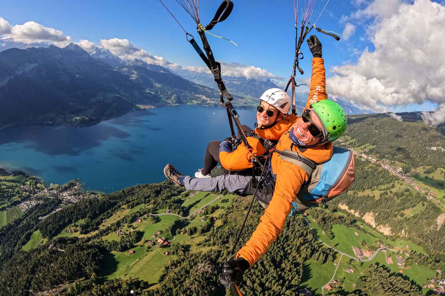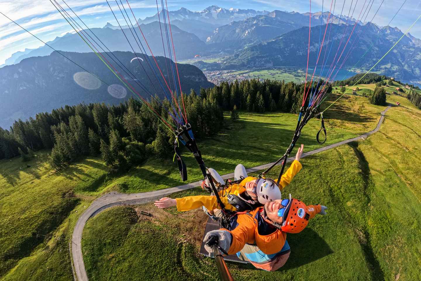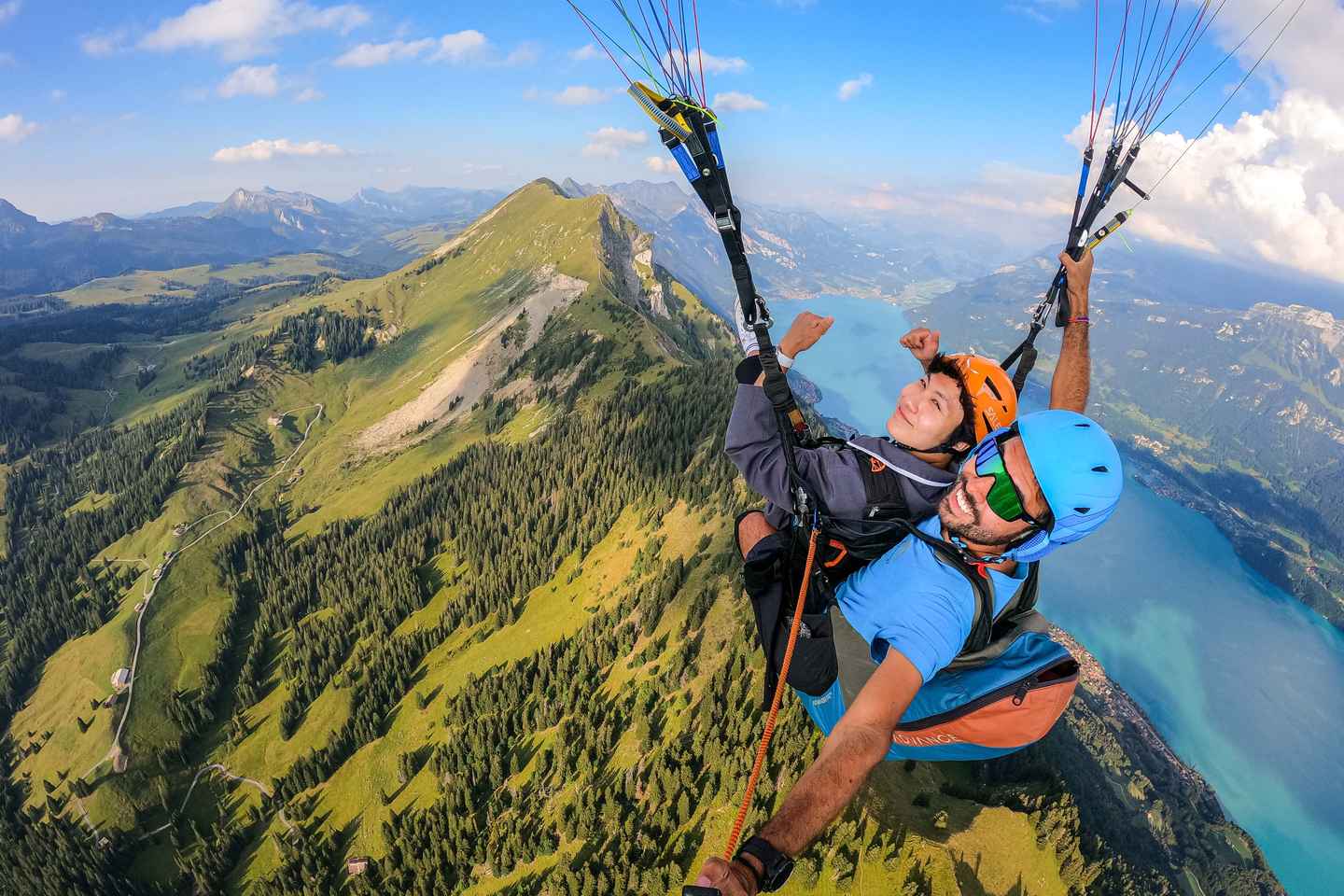 Experience the thrill of tandem paragliding as you soar above Interlaken, Switzerland, taking in breathtaking views of the Swiss Alps and sparkling Lake Thun. This unforgettable adventure begins with a scenic drive to Beatenberg, where your expert pilot prepares you for takeoff from a grassy hillside.