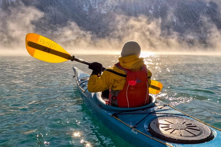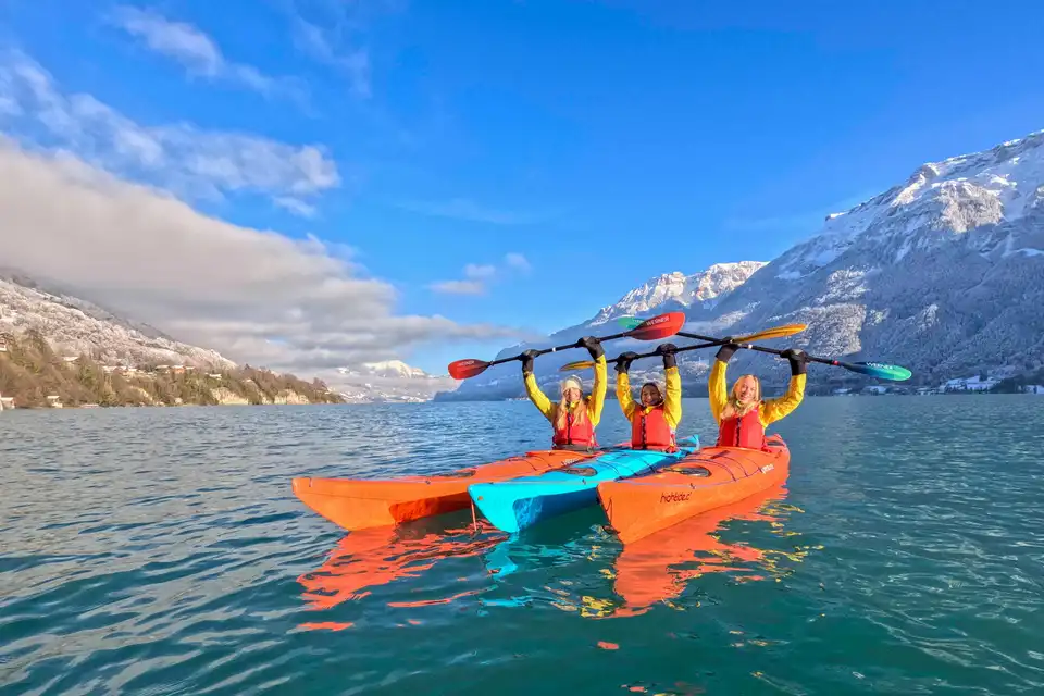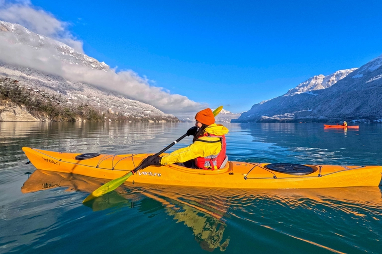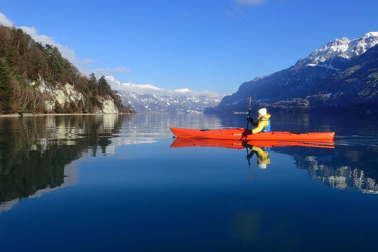 Discover the beauty of Switzerland with a winter kayak tour on Lake Brienz, departing from Interlaken. Glide across the tranquil, mirror-like waters surrounded by breathtaking mountain scenery, where snow-capped peaks are perfectly reflected, creating a truly magical atmosphere.