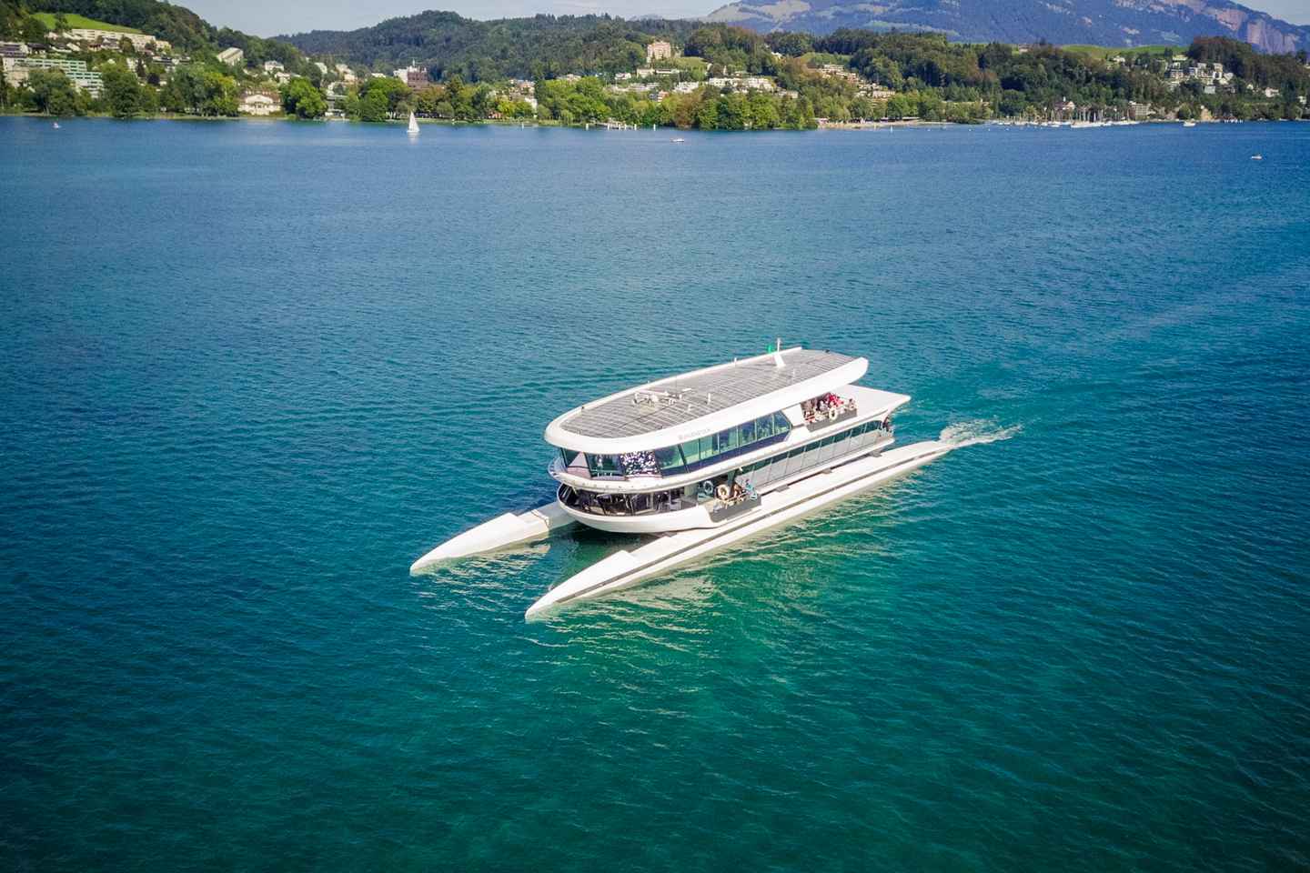 As you glide across Lucerne Bay, marvel at the iconic peaks of Mount Pilatus, Mount Rigi, and Mount Bürgenstock. The modern hybrid-powered catamaran ensures a smooth and comfortable ride, allowing you to fully immerse yourself in the stunning scenery.