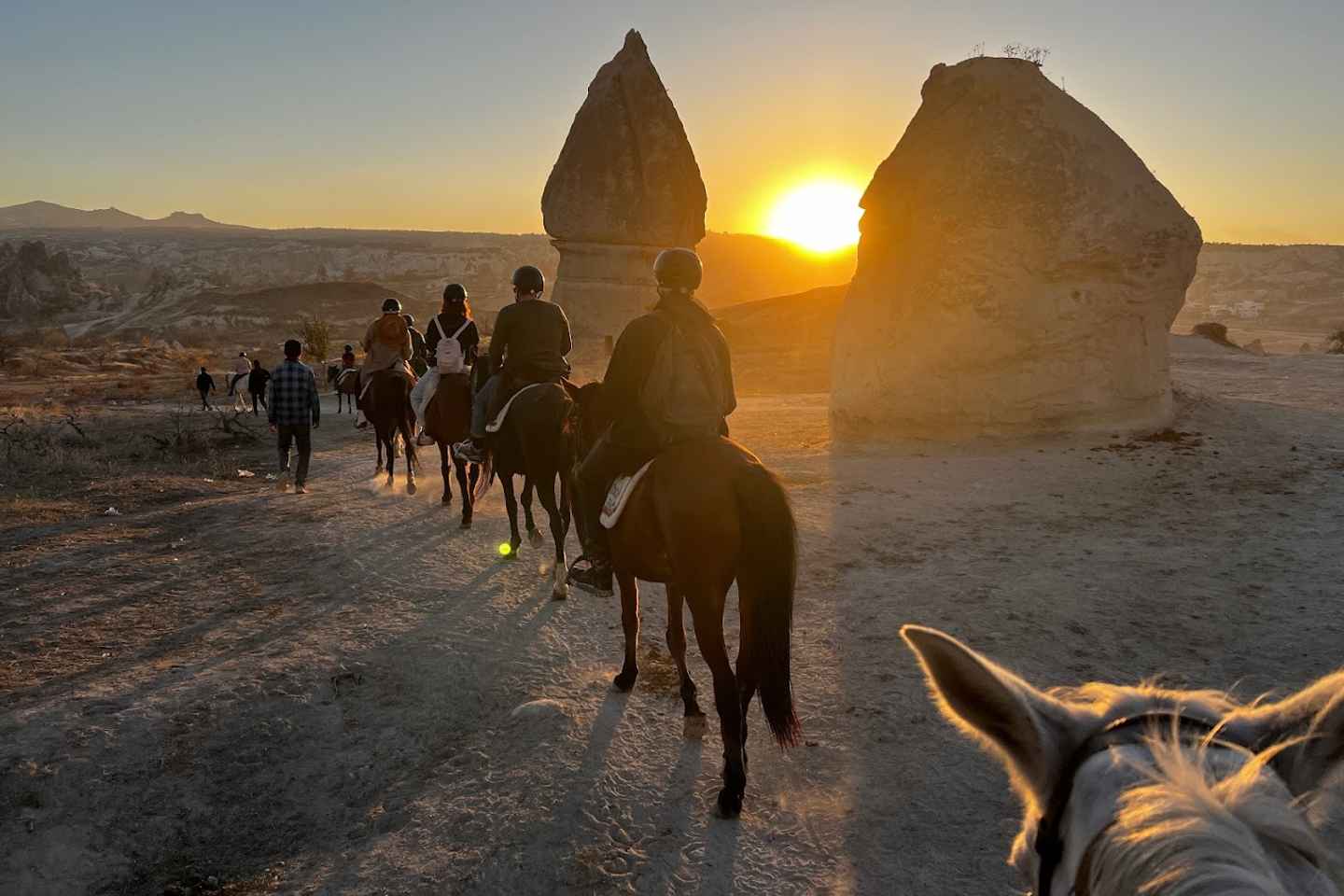 Experience the breathtaking beauty of Cappadocia's landscape on a sunset horseback adventure! Ride through the area's iconic fairy chimneys and colorful rock formations, all illuminated by the setting sun.